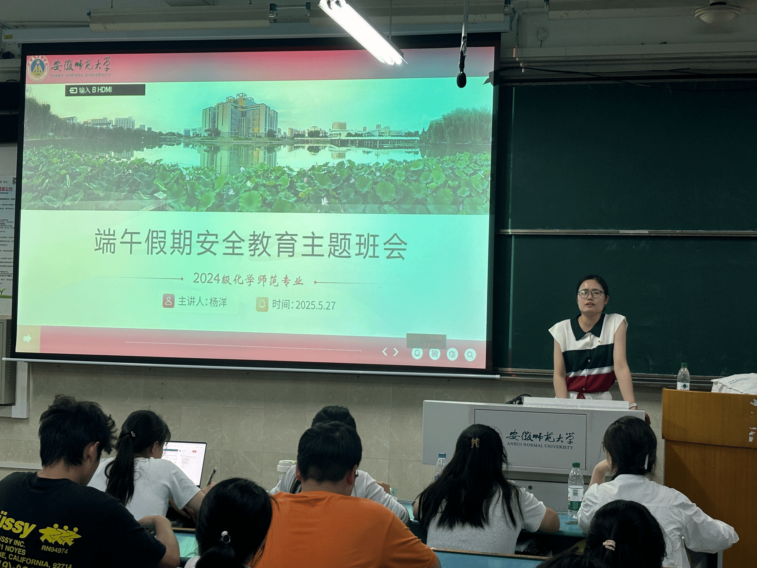 佳节将至,粽叶飘香。5月27日晚,2024级化学师范专业在行知楼1号楼2010303和2010304教室召开端午假期安全教育主题班会。本次班会由辅导员杨洋主持,旨在增强学生安全防范意识,切实保障端午假期安全。