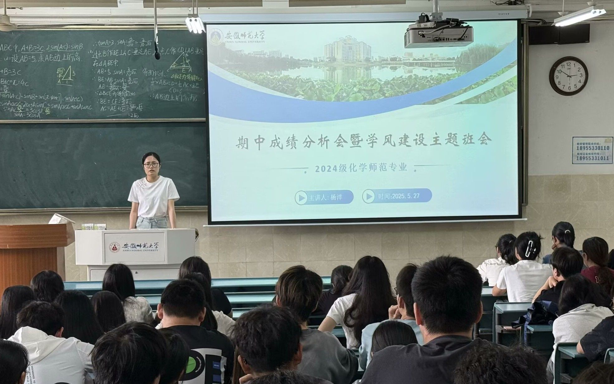 为全面总结前半学期的学习成效,扎实推进学风建设,激发学生学习动力,2025年5月27日和28日晚,2024级化学师范专业分别在1号教学楼2010102、2010303和2010304教室分批次召开期中成绩分析会暨学风建设主题班会。此次班会由辅导员杨洋主持,全体2024级化学师范专业学生参会。