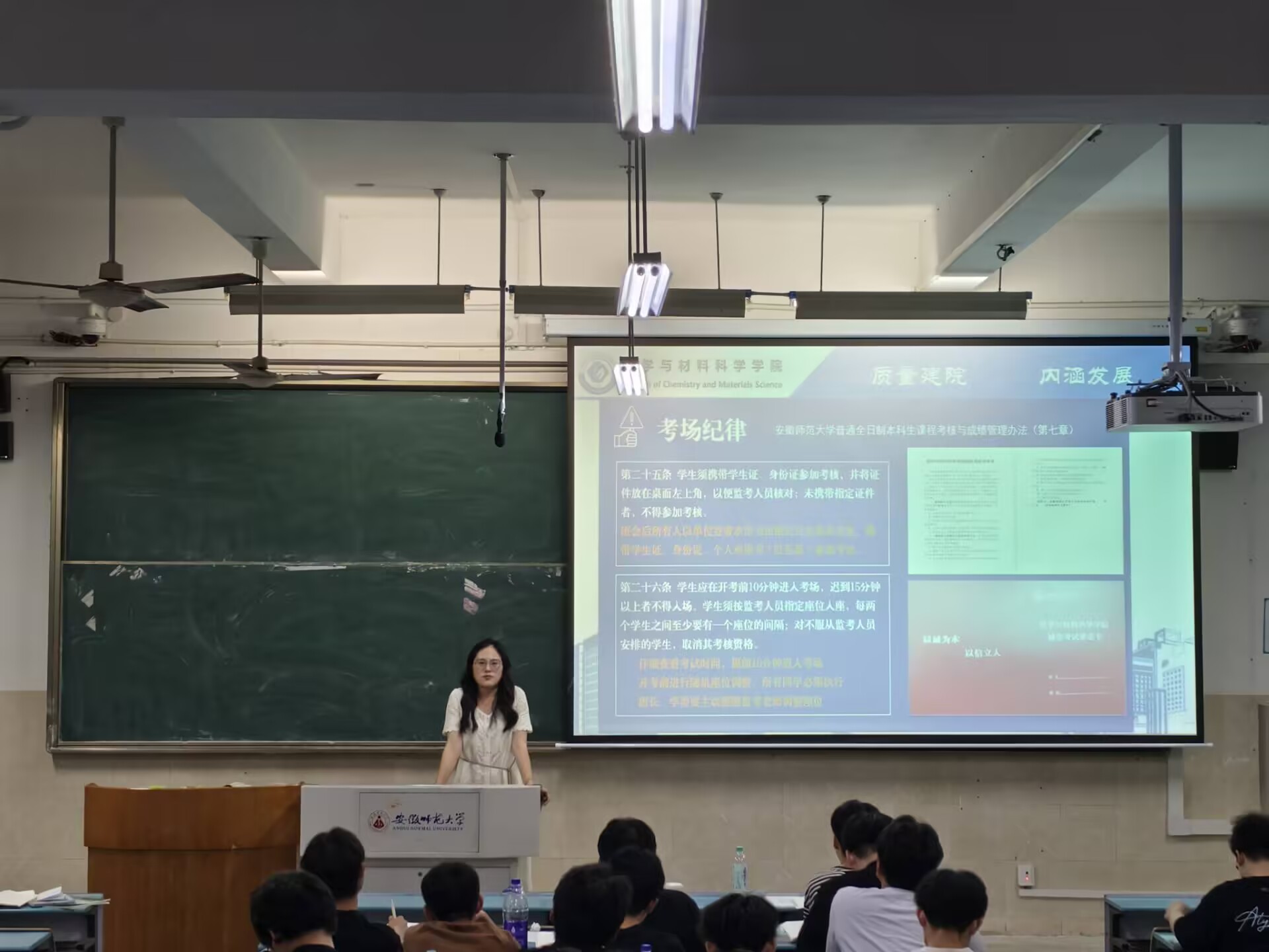期末临近,为严肃考风考纪,强化学生诚信意识,同时确保暑期离校工作安全有序,6月19日晚上,24级化学工科专业在行知楼2010104、2010301、2010308分别召开班会,会议由辅导员王芳老师主持,24级应用化学、化学工程与工艺及新能源材料与器专业全体同学参会。