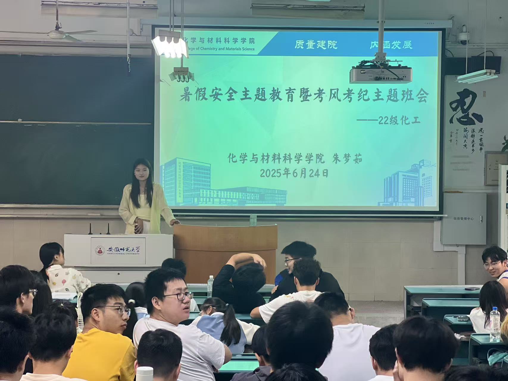 最后,辅导员朱老师对本次班会进行总结。她希望同学们在即将到来的暑假中,时刻牢记安全第一,合理规划假期生活,在放松身心的同时不忘提升自我;在期末考试中,以诚信为本,遵守考试纪律,认真复习备考,争取取得优异成绩。