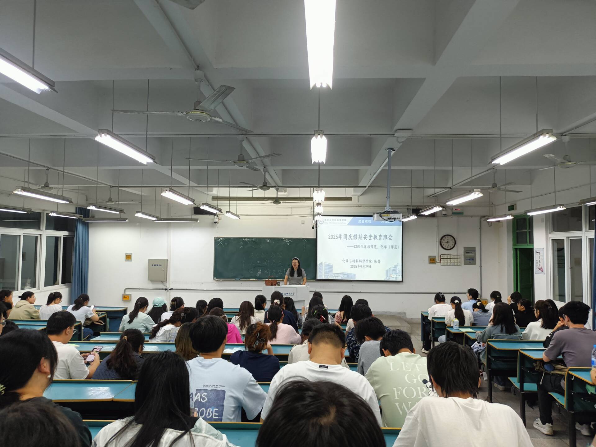 为切实保障学生国庆假期人身财产安全,增强学生安全防范意识,9月29日晚,22级化学师范、非师范专业在2070101教室分批次召开国庆假期安全教育主题班会。本次班会由辅导员陈静主持,专业全体同学参会。