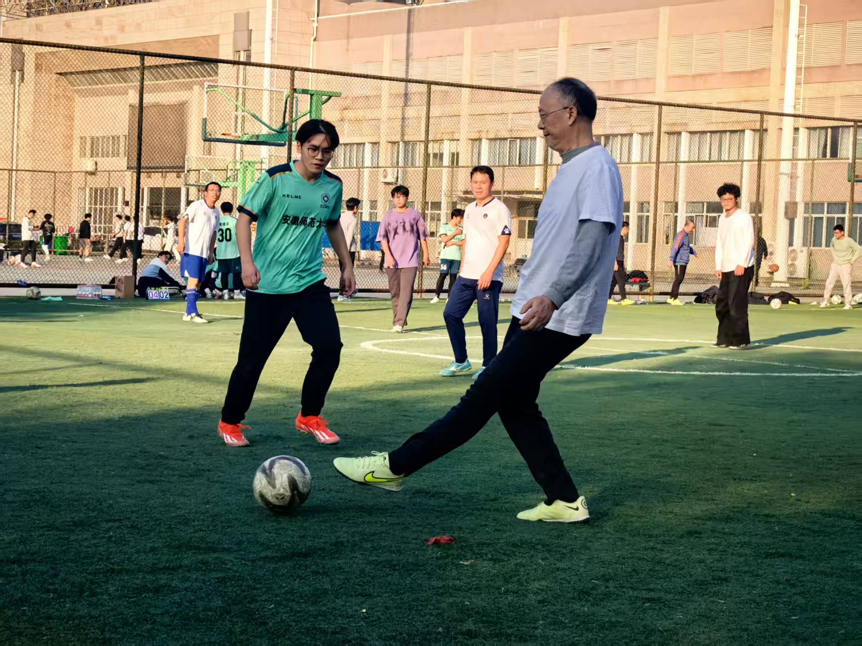 师生昂扬向上的精神风貌。比赛过程中,最令人印象深刻的莫过于一次精彩的团队配合:刘业老师在后场精准送出长传,李忠原老师凭借敏锐的赛场洞察力,精妙传球撕破学生队防线,将球精准输送至前场的芮先红老师脚下,芮老师沉着冷静摆脱后卫纠缠,面对门将从容推射破门,帮助教师队进一步扩大比分优势,这一系列连贯流畅的配合赢得全场阵阵掌声。