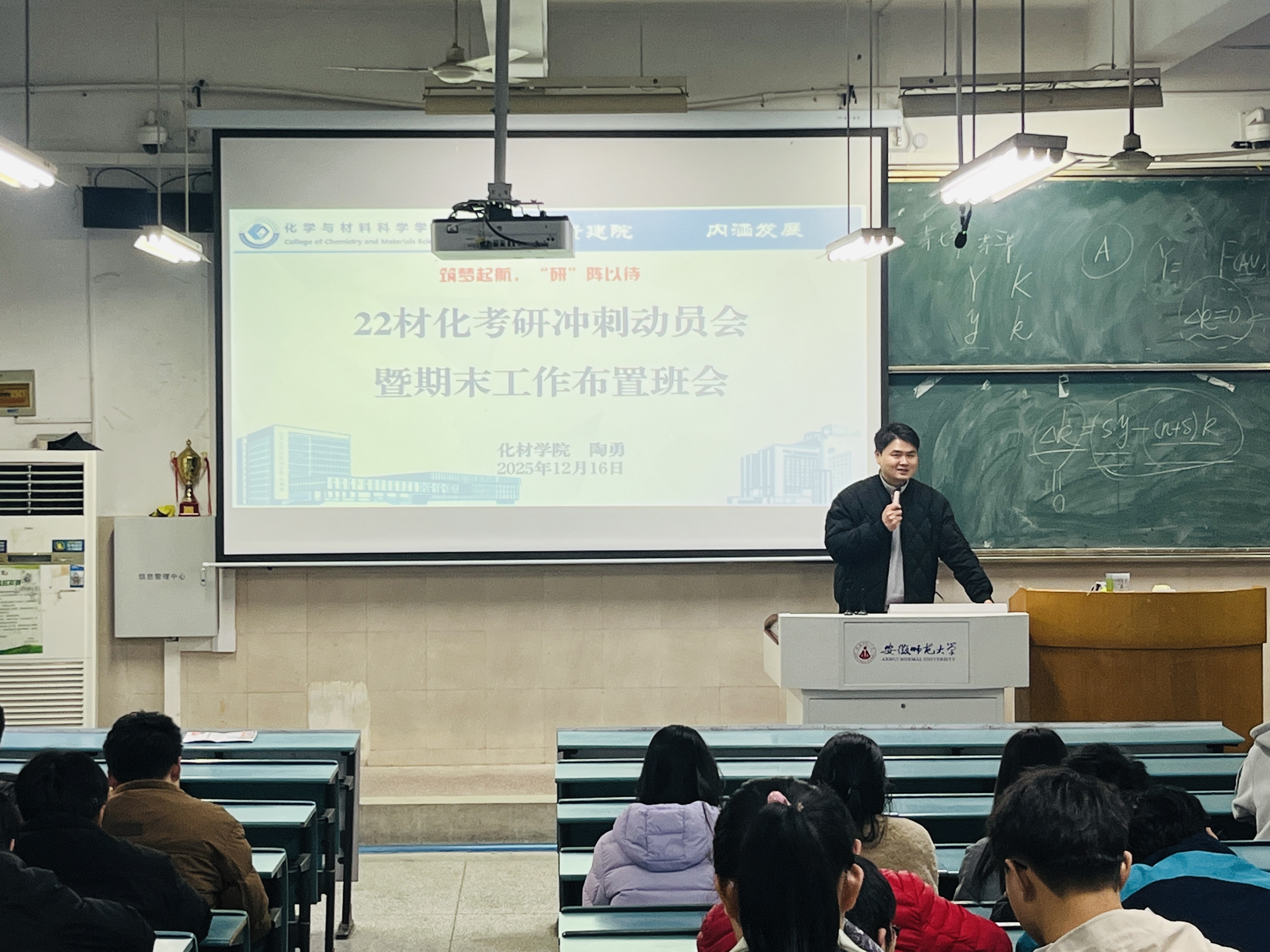为切实做好研考前诚信教育等相关工作,助力毕业班学生以最优状态冲刺研究生考试,同时统筹规划期末各项工作,2025年12月16日,辅导员陶勇于行知楼2020102教室召开“筑梦起航,‘研’阵以待”2026年研究生入学考试冲刺动员暨期末工作布置班会,22材料化学专业全体学生参会。