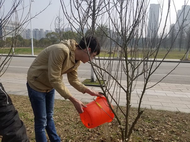 活动主办负责人首先为大家介绍了此次植树节活动举办的意义,并对植树护林的相关知识进行了详细解说,同学们都听得十分仔细,生怕错过了什么植树的技巧。解说过后,参与活动的同学排队前往外联财务部处领取植树护林的相关工具。之后,在环协能源低碳部人员的指导下,大家分别分区域进行锄草、浇水,给树木松土、挂牌。
