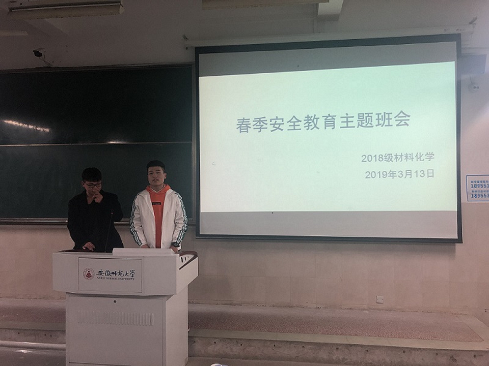宣讲结束后,班级的安全委员武凯、储东睿共同主持召开了班级第一次春季安全教育主题班会,其中强调最多的是宿舍的用电安全。从插排问题、手机充电安全和出门断电这三个方面为大家提出了要求和建议。同时安全委员也强调了心理问题预防和预防春季流感。班会的最后,辅导员对班会进行了总结和补充,他从宿舍用电安全、离校登记、食品安全、外出兼职等几大方面再次向同学们做了要求和提醒。