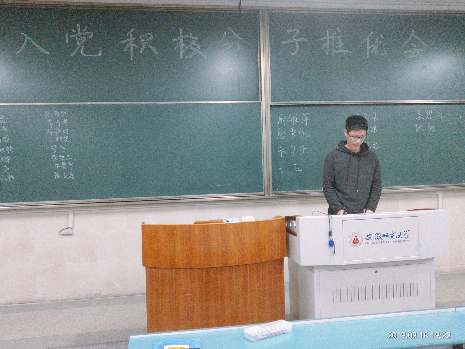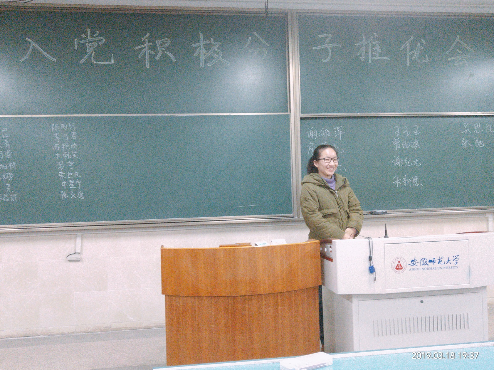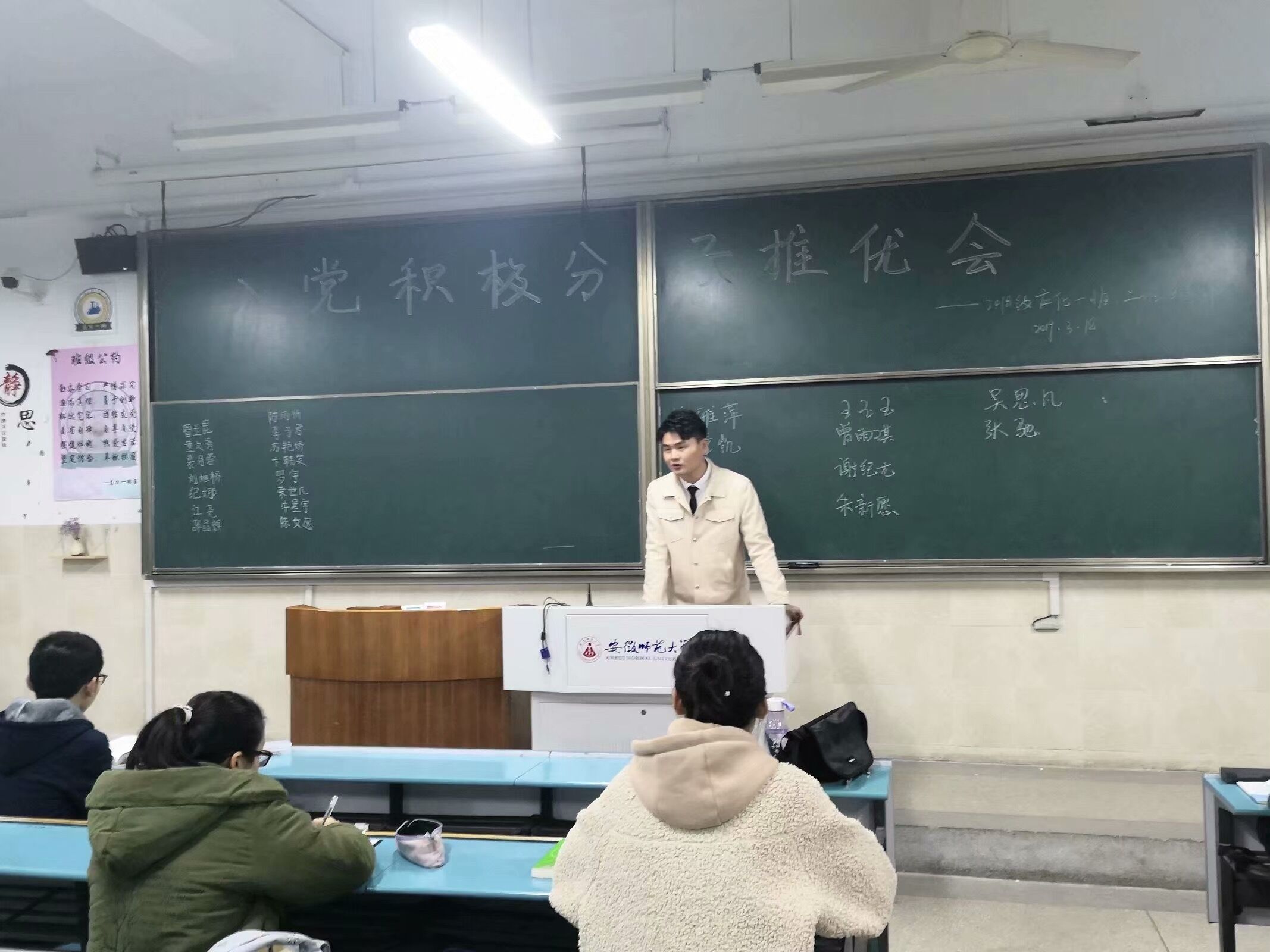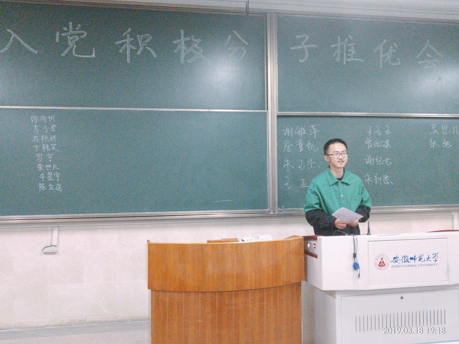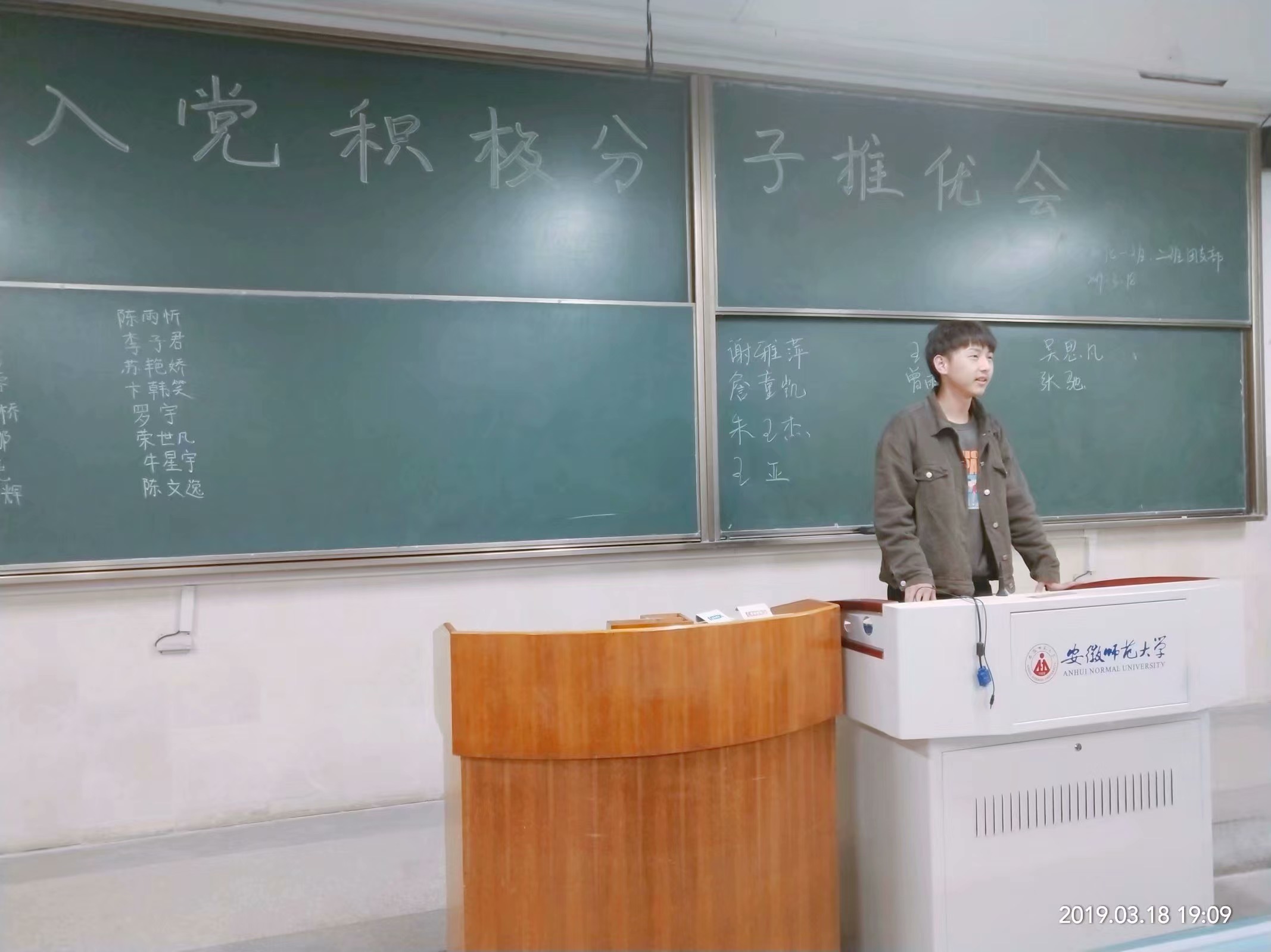 本网讯(18应化二班 曾雨琪)2019年3月18日,为了让班级同学更加系统地学习党的基本知识和理论,提高自身修养,积极发挥模范带头作用,辅导员陶勇老师在应用化学专业发起了“入党积极分子推优”活动,旨在吸收班级内较为优秀的同学成为入党积极分子,积极向党组织靠拢。 活动伊始,辅导员陶勇老师首先向同学们表达了他对本次推选的期望与要求:端正入党动机、明确入党要求、树立远大目标、发挥模范作用,随后便开始了此次推优活动。整个推选进程打破常规,没有固定的上台次序,秉持着自由民主的原则,在专业内排名前40%的同学先后上台,娓娓道来他们各自的入党初衷,过去一学期的付出和收获以及对于自己是否能入选的看法,应化专业共有25位同学参与了本次推选。 他们脱稿发表即兴感想,真情实意地陈述了个人对班级以及对学校的贡献,表达了对入党的向往,以及自己对党的认识理解。活动进行中,有很多同学表明家里有优秀共产党员,家庭氛围的熏陶在他们稚嫩的心灵里埋下了希望的种子,让他们对共产党生出了无限向往。活动接近尾声之时,应化同学实行投票选举,最终两个班级各有六名同学当选。 “组织入党一生一次,思想入党是一生一世!”相信所有入党积极分子都能担得起应有的责任,在成为党员的路上越走越远,遇见更好的自己!