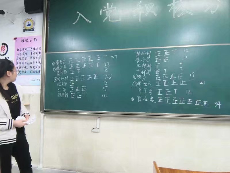 他们脱稿发表即兴感想,真情实意地陈述了个人对班级以及对学校的贡献,表达了对入党的向往,以及自己对党的认识理解。活动进行中,有很多同学表明家里有优秀共产党员,家庭氛围的熏陶在他们稚嫩的心灵里埋下了希望的种子,让他们对共产党生出了无限向往。活动接近尾声之时,应化同学实行投票选举,最终两个班级各有六名同学当选。