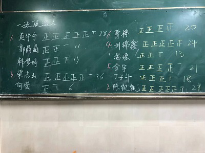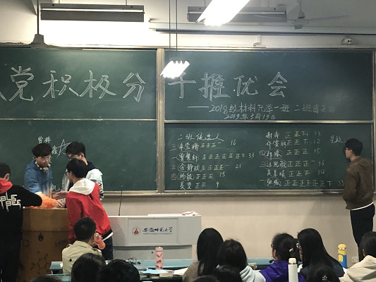 宣讲完毕后,各班进行无记名投票,分别选出六位入党积极分子,由不参与竞选的同学进行现场唱票。最终结果为材化一班的黄宁宁、陈凯凯、梁志山、刘锦鑫、金宇、曹梅;材化二班的张强、曾繁轩、余静玟、朱莹珊、汪思敏、郑瑶,共12位同学成为入党积极分子,各班票数最高的前四位获得了参加此次班培训资格。