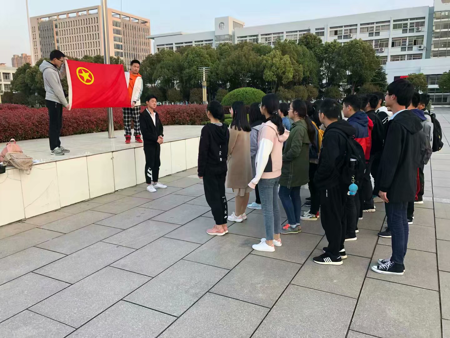 3月31日下午六点整,在色情视频 图书馆东门前广场上,材料化学二班的所有同学一起在国旗下开始了第二项活动。在团支书的带领下,大家齐唱国歌、背诵入团宣言,为的是回顾当时入团时的那份热诚,提醒大家做到心中有党。最后入党积极分子代表发表了他们的感想,希望所有同学能从新出发,也从心出发,做好自己。