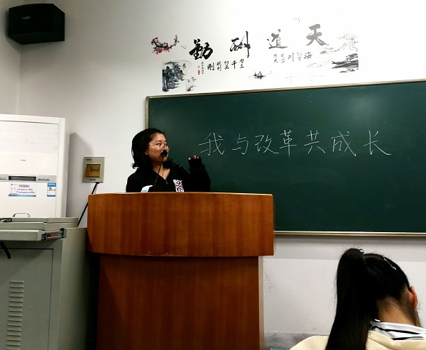在“我与改革开放”的班会中,团支部书记带领我们观看了团支部精心制作的课件。一幅幅岁月痕迹,一幕幕时代变迁,足以让我们慨叹改革开放的伟大意义。四十年,让一个曾经落后挨打的国家,走向和谐,走向繁荣,走向富强。同时,团支书也结合班级专业特色,介绍了四十年之内化工行业的发展。这些,使我们坚信,我们的国家定会傲立于世界之林!