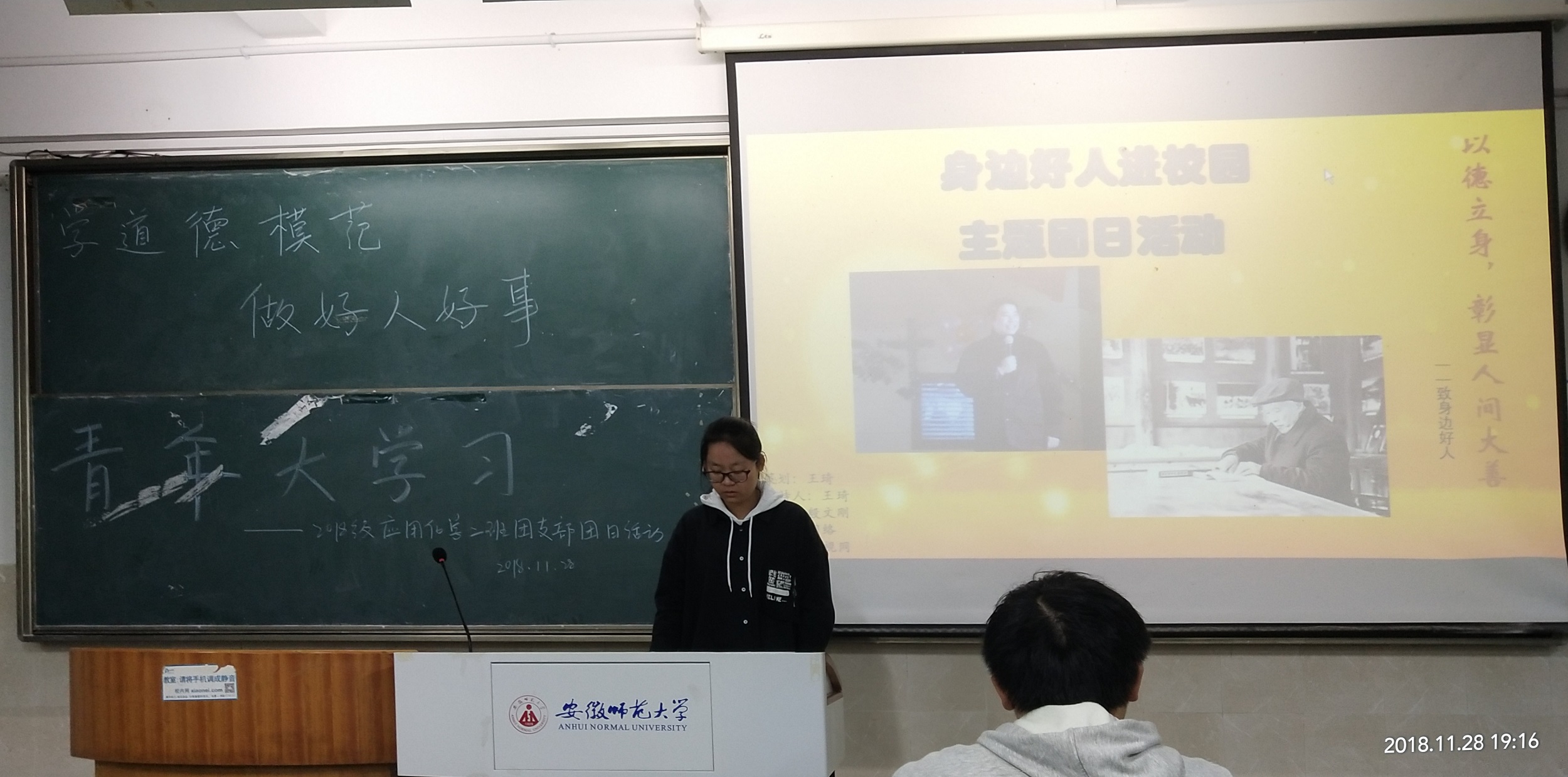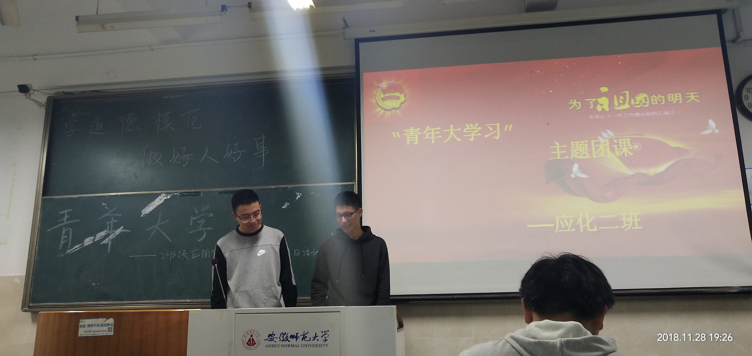 本网讯(18级应用化学王琦)2018年11月28日,团支书王琦向应用化学二班全体同学介绍了校内的道德模范并带领同学们统一进行了"青年大学习"系列的团课学习活动,旨在学习优秀共产党员品质精神、了解党的指导思想与深刻内涵。 团支书王琦列举了两个道德人物,其中一位是师大马克思学院最美思政课教师–路丙辉,二十六年来,“做一个温暖的老师”一直是他的座右铭。用温暖给予锻铸师魂,将思想政治教育工作延伸到无限的为学生服务中去。不仅如此,他还通过第二课堂认识了一批需要帮助、渴求引导、追求梦想的学生。凡是被路丙辉发现的,不管是通过什么渠道认识或了解的,只要是需要帮助的学生,没有一个被放弃,甚至是贫困山区的贫困儿童,都会得到帮助。这令同学们钦佩,多年来,数百名学生受到不同程度的帮助和指导,获得长久发展。 接下来,由第二团小组组长吴思凡及吴吉祥同学向大家介绍了5期青年大学习中的知识,同时说出了他们的真实感受。同学们通过今晚的学习,通过本次团课,使得同学们对共青团组织又有了进一步的了解,同时也勉励每个一位同学在今后的学习生活当中,时刻要以团员的标准要求自己,不断努力,学习道德人物的优良品质,朝着更高的目标去奋斗。