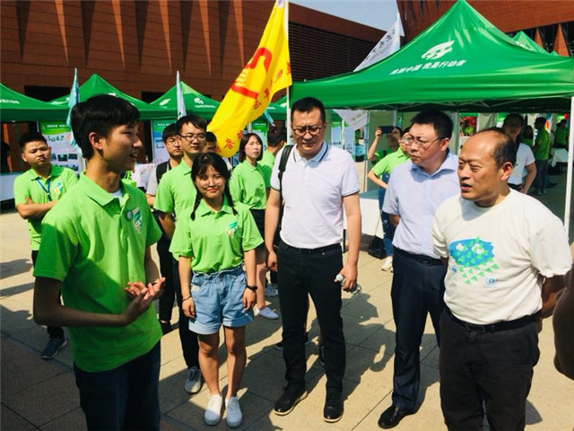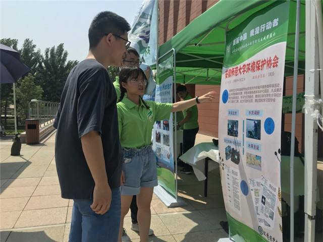 下午1点半,户外展示活动开始。来自全国统一价的近70余所优秀社团代表纷纷积极为参会人员进行社团简介和项目介绍,我院环境保护协会的两名代表也向过往的领导、其他社团代表等简要介绍协会和入围项目,展示了环协的历史发展和优秀事迹。2:40左右,环境保护部宣传教育中心主任贾峰、北京市环境保护局副局长王瑞贤、清华大学校团委书记邴浩等领导嘉宾对本次活动进行参观指导,与学生展开交流,并向学生询问其社团环保活动的具体情况。