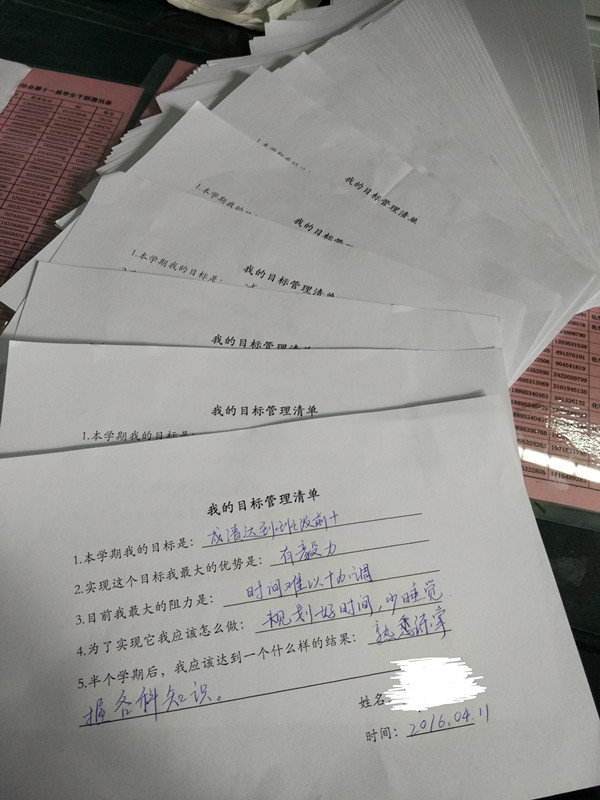 班会的最后,同学们现场填写“我的目标管理清单”,思考本学期的目标、实现目标的优势和阻力、实现目标的措施以及预期效果,督促同学们明确奋斗目标,从现在开始做好自我目标管理工作。