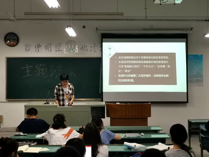 晚上七点三十分,班会正式召开。徐千千同学简要介绍了长三角地区的范围,以及“长三角峰会”的形式及内容,使同学们对“长三角峰会”有了一个初步的了解;之后,徐千千同学由表及里,深入分析了本次“长三角峰会”对芜湖有何影响,芜湖作为长江经济带产业创新中心,此次长三角峰会将给芜湖带来全新的发展和机遇;同时,徐千千同学展示了长三角峰会将推动发展的几个主要方面,从这几个方面来看芜湖将有很大的发展空间。同学们结合峰会期间发生的一些花絮和网友们的评论,表达了对芜湖未来发展的美好期望。