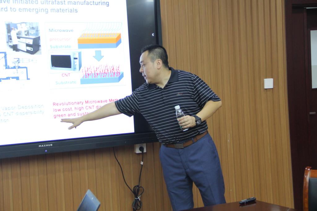 柳祯博士作了题为“High Rate Nanomanufacturing toward to Emerging Technologies and Opportunities”的学术报告,柳博士首先介绍了导电材料及导电纳米材料的一些基本知识。导电材料因其优于传统材料的优势而得到广泛研究,包括宽电容和可调电导率,易于制备,高机械稳定性,重量轻,成本低和易于加工等优点。导电纳米材料的形成在诸多领域如能量存储,传感器,能量收集,纺织工业等方面有了更近一步的应用。随后,柳博士概述了其过去几年在纳米工程导电材料方面所做的一些工作,并举例说明了导电纳米材料的应用,讨论了纳米导体的制备方法,提出了制备多功能纳米材料/纳米复合材料的最新趋势,研究了它们的导电机理及定制其性质的方法,详细阐述了开发更好的导电基纳米材料的最新挑战。与会师生就柳博士的报告内容进行了深入讨论和交流,表示受益匪浅。