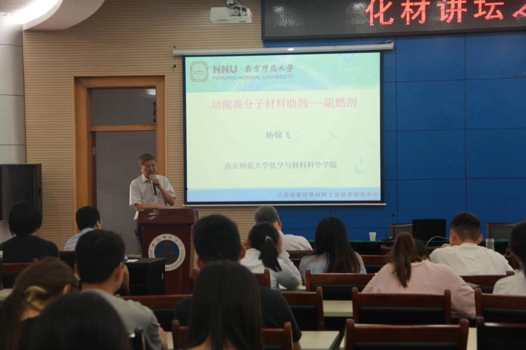 杨锦飞教授作了题为“功能高分子材料助剂-阻燃剂”的学术报告。杨教授首先介绍了阻燃剂的定义,并简单概括了国内外对阻燃剂的发展状况,其中着重讲解了磷系阻燃剂,磷酸酯阻燃剂近年来发展迅速,随着阻燃剂无卤化的发展,磷酸酯阻燃剂在工程塑料以及热固性树脂方面的应用逐步扩展。最后简要介绍了自己的研究团队。会后,杨教授与与会师生进行了互动讨论。