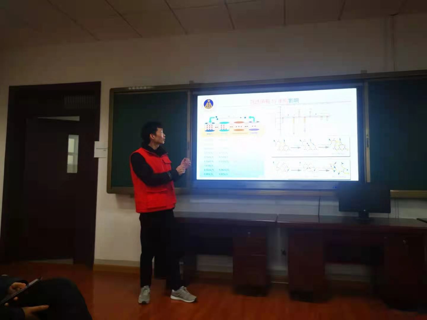 周震教授作了题为“从计算机模拟到人工智能的能源材料创新”的学术报告。周教授首先从新能源的储存与转化开始,介绍计算机辅助研发的重要性及意义,并举例说明数据库如何筛选出我们预期的功能性材料。随后介绍了高能量密度电池,并设计构建生物质电池材料,通过用Clar理论解释有机电极材料的电压,找到符合我们期望的有机材料,而且可以通过电池初期的电池容量来模拟计算电池寿命,大大减少实验时间和数量,这对未来的研究方向有重要影响。与会师生与周震教授进行了热烈而友好的互动交流。会后,周震教授还听取了黄玉成课题组研究生汇报,并对其研究工作进行了指导。