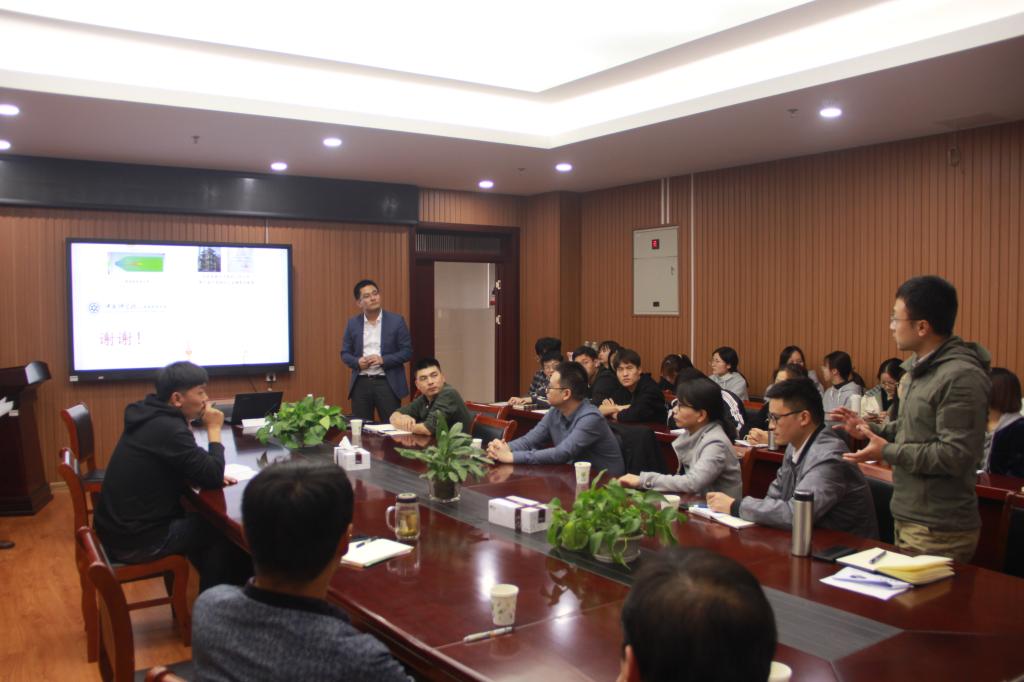 唐志永研究员作了题为“未来反应工程-道法自然的微流控化学”的学术报告。唐研究员首先介绍了反应工程的发展趋势,即围绕着传质和传热,由固定床、流化床发展为微流控化学技术。随后唐研究员介绍了在自然仿生分形工程的基础上受到的启迪从而建立仿生微分形微反应工程。唐研究员团队结合仿生分形理论设计新型反应器,并且利用CFD数值模拟,优化反应器结构,从而提高效率。唐研究员还介绍了微分形反应工程的应用领域,能源材料与催化剂的3D制造和桌面工厂-装备的3D制造。阐述了仿蜂窝分形微反应器强化FTO反应过程、仿蜂窝分形微反应器强化烯烃氢甲酰化过程和分形微气泡分布器强化烯烃氢甲酰化过程。最后唐研究员介绍了单分散性二氧化硅微球的连续流制和连续流光催化反应,小型高效的反应方式,提高过程强化,质的变化从而提高反应效果。会后,唐志永研究员与学院师生就报告内容展开了讨论与交流,对与会师生提出的问题进行耐心而细致的解答。