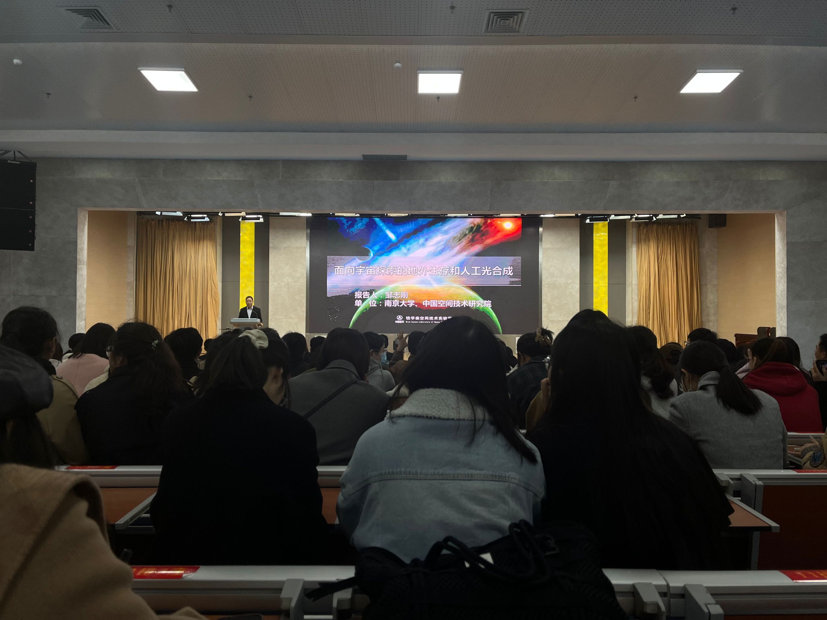 邹志刚院士作了题为“面向宇宙探索的地外生存和人工光合成”的学术报告。邹院士首先介绍了我们当前所处的时代是与百年之前的“大航海时代”类似的“大航空时代”,并且从人类面临的三大基本问题——生命的起源、人类的命运和地外文明出发,详细阐明了当前航空所面临的问题和困境。飞天揽月是人类古今以来的梦想。邹院士认为开展地外材料科学研究是圆飞天揽月之梦的重要途径。这是因为载人深空探测需要必须满足地外生存在物质和能量上的基本需求。原位资源利用是支撑地外人类活动的核心技术,地外人工光合成技术可同时供应能源、养分、氧气,消除CO2,实现生命保障。邹院士还就发展“人工光合成”科学与技术的原因做了系统阐述,并详细讲解和举证了发展人工光合成的机遇与挑战,面向载人深空探索和人类长期地外生存面临的基本物质与能量需求,面向月球矿物和能源资源,发展基于嫦娥五号月壤的2-3种地外人工光合成材料及其可控制备技术,构建高效地外人工光合成材料体系,阐明地外人工光合成材料在地外特殊环境的作用机制,发展地外人工光合成系统,实现空间环境实验验证,为地外生存提供一条变革性的技术路线。最后,邹院士回顾自身心路历程,用“学会感恩”四个字总结自己为科研奉献的半生。将自己的切身体会汇总成一句话:“青春逐流,梦不随波”送给在座的同学,希望同学们能够努力学习,不负韶华,早日为祖国的科学研究贡献自己的力量。