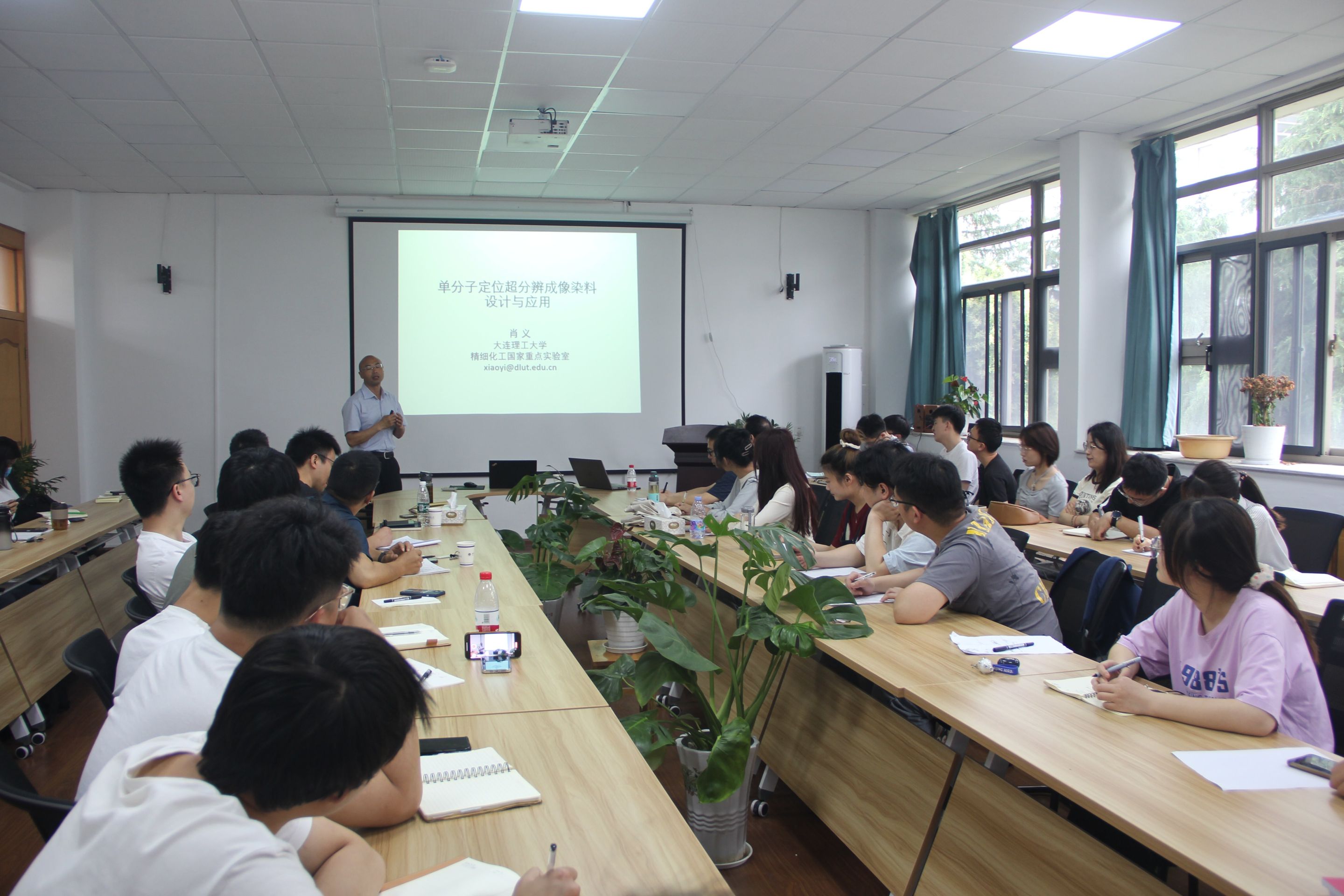 肖义教授作了题为“单分子定位超分辨成像染料设计与应用”的学术报告。肖教授首先介绍了会议的背景:①生命科学研究中,许多过程发生在衍射极限以下,②传统的纳米尺度观察需要使用电镜,而其要求对生物样本进行固定,不能够实现活细胞直接观察。接着阐述了单分子定位超分辨探针性能基本要求:亮度、亮暗态开关性、标记特异性与效率、光稳定性四个基本要求。最后肖教授介绍了罗丹明染料与元素替换站吨染科的发展历程、蛋白标记的挑战-标记密度影响单分子定位密度以及罗丹明适合单分子定位超分明的关键性。并表明了罗丹明螺环开关:化学传感器设计的关键,也是激活功能设计的关键。会后,肖教授回答了与会师生提出的问题。