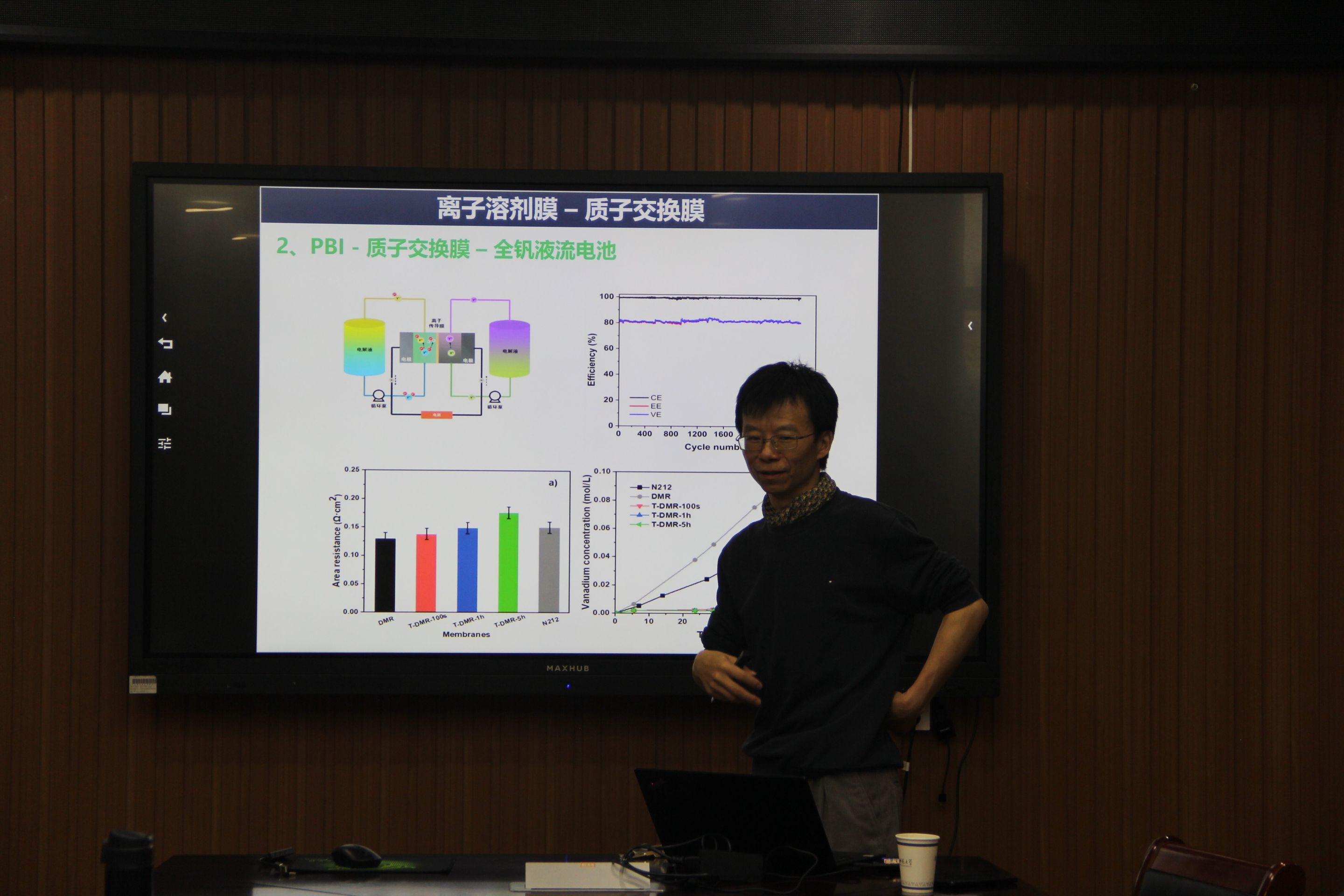 李南文研究员作了题为“离子溶剂膜与新能源应用”的学术报告。李研究员首先简要介绍了工业生产上的重大需求,“双碳”目标离不开可再生能源。接着介绍了与能源储存息息相关的离子交换膜。离子交换膜作为电池的心脏,具有阻隔气体,电子绝缘和离子传输的功能。并从工业生产的角度详细介绍了离子交换膜的发展。一是可以吸附磷酸硫酸等的质子交换膜,二是可吸附KOH的碱性离子膜。最后李研究员对离子溶剂膜进行了总结。会后,李研究员与参加会议的师生展开了一系列的学术讨论与交流。