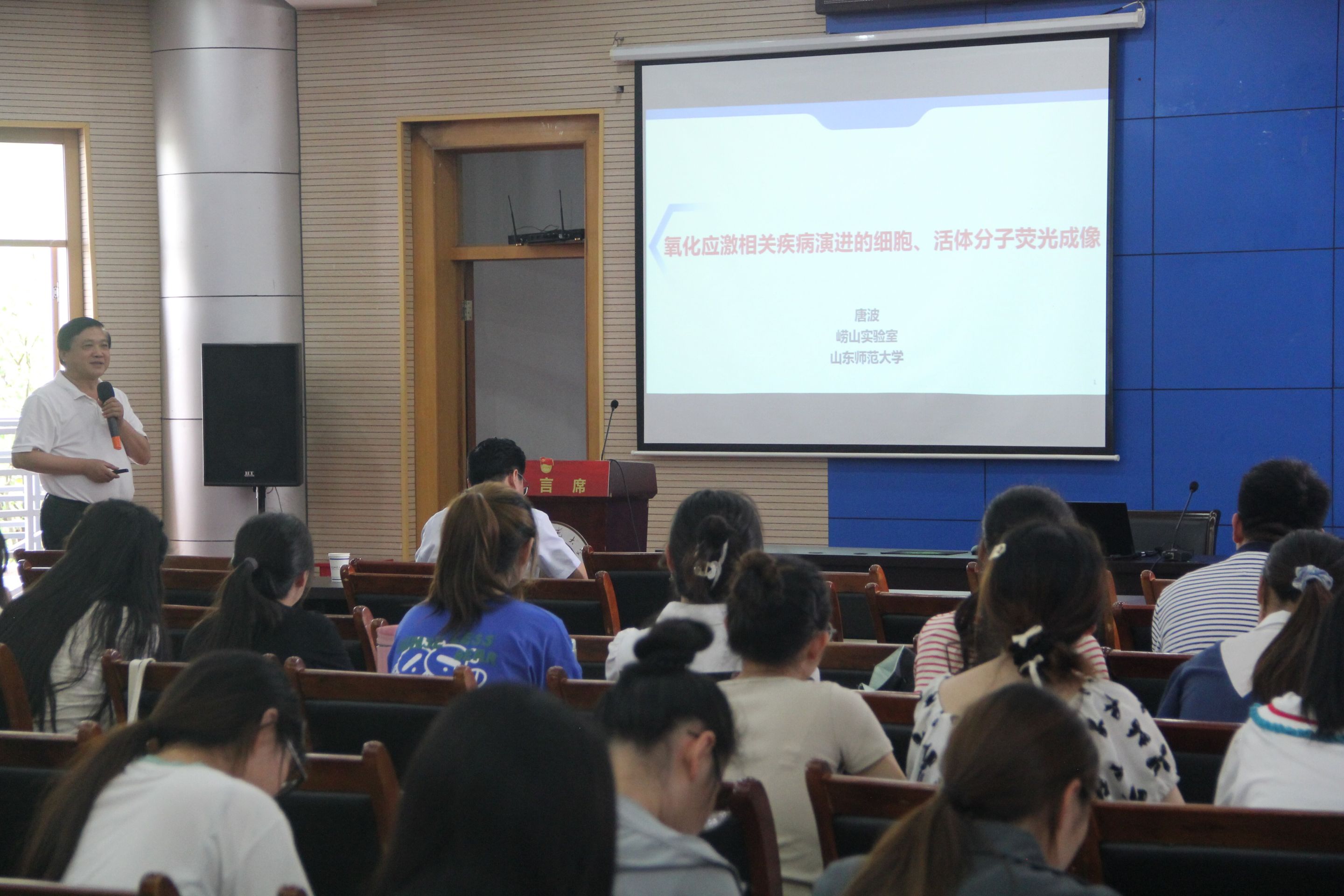 唐波教授作了题为“氧化应激相关疾病演进的细胞、活体分子荧光成像”的学术报告。唐教授首先简要介绍了氧化应激相关疾病的研究背景,以及荧光成像的原理。并以抑郁症为例,介绍了活性氧和神经递质水解酶对抑郁症的影响,以及脑部羟基自由基对蛋白的氧化损伤对抑郁症的诱发。随后介绍了心血管疾病,包括磷酸化水平与pH介导动脉粥状硬化,香烟烟雾通过蛋白质磺酸化诱导血管损伤和谷氨酰转移酶与ROS诱发动脉粥状硬化。再次以肝脏疾病为例,主要讲解了溶酶体内ROS与丙二醛诱导肝脏缺血再灌注损伤。最后,唐教授对氧化应激相关疾病演进的细胞、活体分子荧光成像进行了总结。课题组率先创制了系列ROS、金属离子、疏基化合物、核酸、蛋白的高灵敏、特异性成像探针;发展了相关细胞活性分子的荧光成像,研究了相关细胞事件活性分子的互作通讯对细胞功能的调控作用;描绘了与ROS相关的疾病演进过程中相关活性分子转导的细胞信号通路,研究了疾病发生发展的分子机制,为重大疾病的诊疗提供新材料、新方法。会后,唐教授就报告内容回答了与会师生提出的问题。