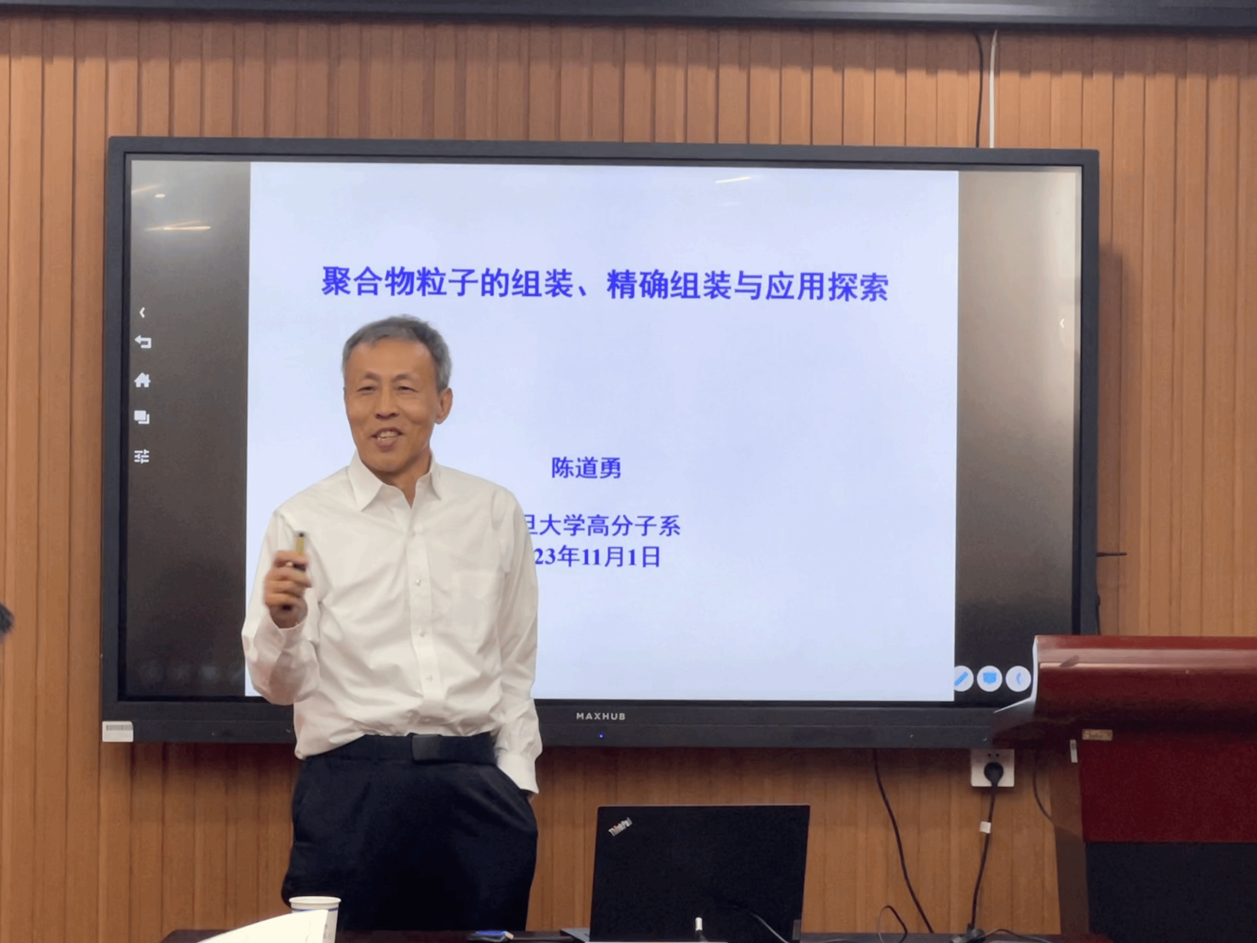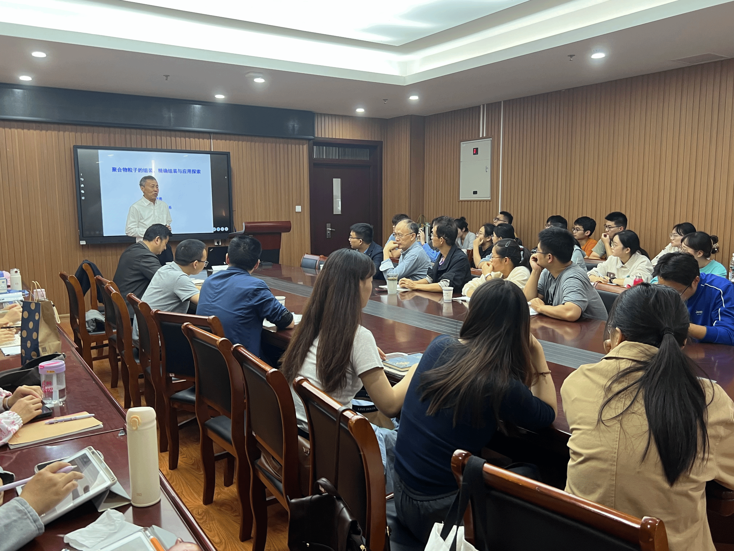 陈道勇教授作了题为“聚合物粒子的组装、精确组装与应用探索”的学术报告。陈教授首先讲解了利用预组织与能量优化,能够实现大分子体系的精确自组装,获得一系列结构规整甚至精确的组装体。并且控制体系的相互作用,可以使得介观体系的组装行为与微观尺度的分子行为相近。最后陈教授阐述了气泡体系能够最为有效地增加体系中的光程,且Janus粒子可以构建宏观尺度有序的内建电场。会后,陈道勇教授就报告内容与与会师生展开了一系列讨论,并回答了与会师生提出的问题。