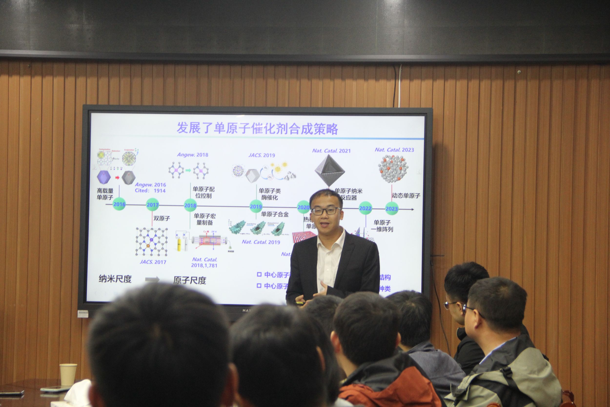 吴宇恩教授作了题为“能源小分子的活化:从纳米到原子”的学术报告。吴教授首先介绍了目前单原子设计的现状以及单原子催化剂的合成瓶颈与应用探索。随后讲述了单原子材料的应用:多种化学反应交叉融合,如H2作为连续质子源直接过氧化氨电合成、输出氨与氧直接参与串联反应、H2作为连续质子源连续氨气电合成等。最后,吴宇恩教授分析了单原子材料发展的现有挑战并提出相应建议,并与参会师生进行了深入的交流。