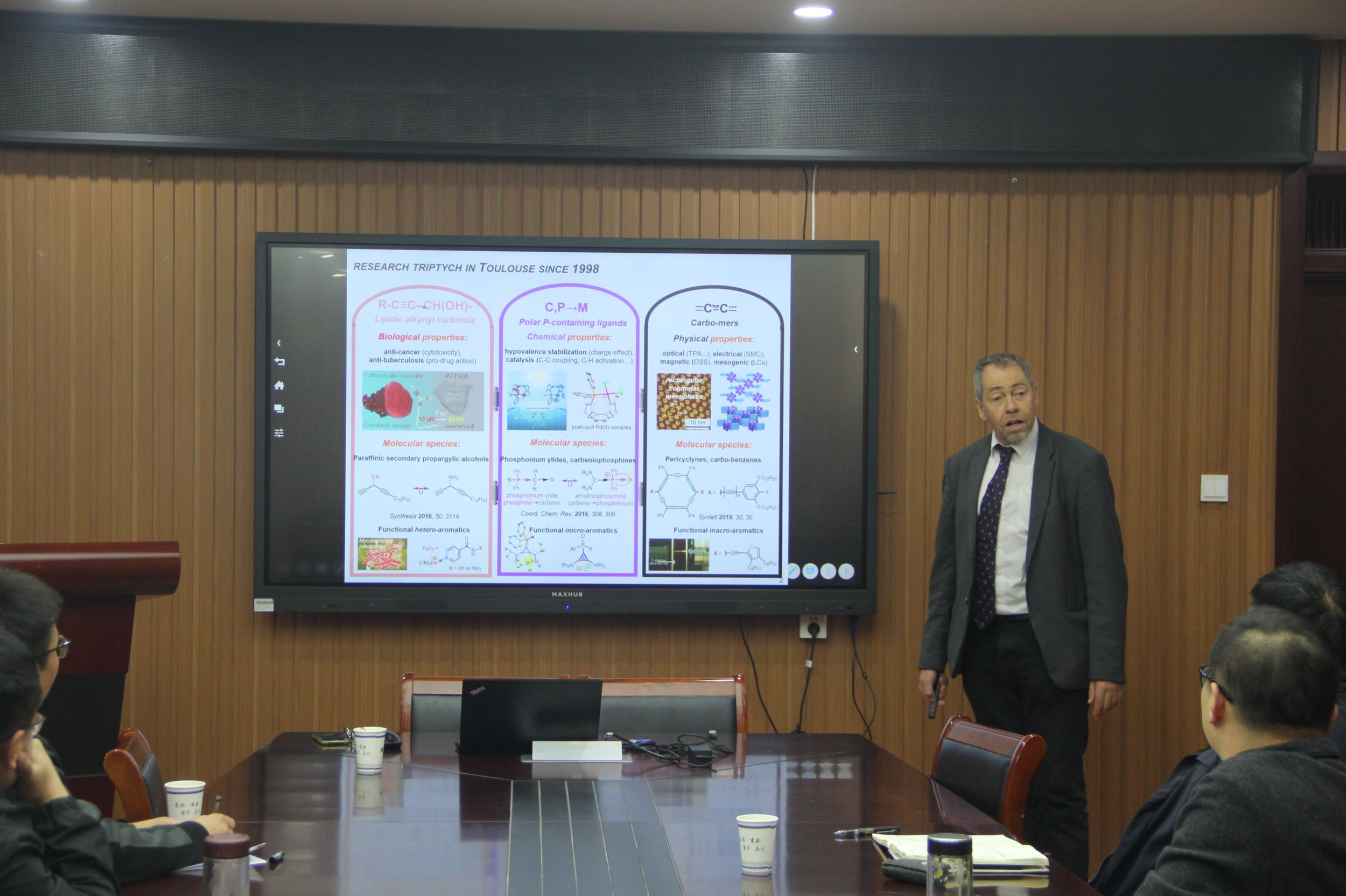 Remi Chauvin作了题为“Newcomers to the carbo-benzene family with heteroatomic / paraffinic dressings”的学术报告。Remi Chauvin教授围绕其课题组在磷化学、碳化学、环氧碳环C-P键:邻苯二甲酰氯、碳环内C-P键:碳(二氢)膦等四个方面开展的工作进行了详细阐述。会后,Remi Chauvin与与会师生展开了一系列学术讨论,并回答了与会师生提出的问题。