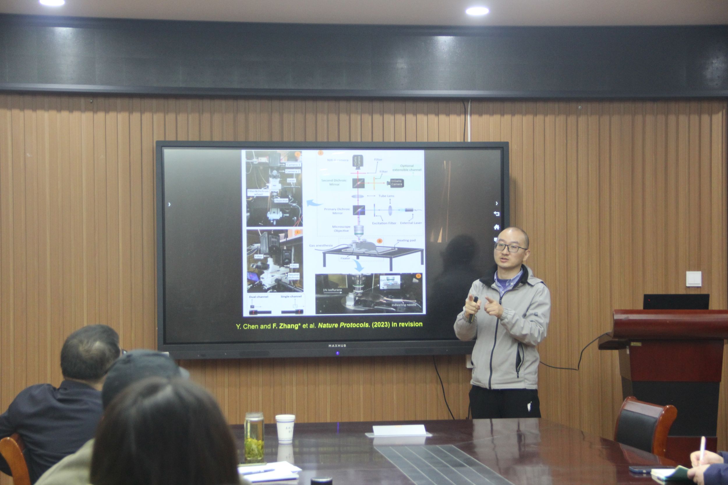 凡勇教授作了题为“透视人体健康的新技术——近红外光化学探针用于生物医学诊断”的学术报告。凡教授分享了其团队深耕多年的一项新技术——只需在活体内注射会发光的近红外荧光分子“探针”,结合对人体没有伤害的近红外光学成像仪器,就能隔着皮肤和肌肉监测体内活动,这一科技进步有望在未来为疾病诊断提供新路径。其团队专注于在近红外二区窗口(NIR-II;1000 ~ 1700 nm)内探索活体深组织成像窗口,并且根据获得的最优窗口开发对应的长波荧光探针和成像仪器,到目前为止已经成功获取了生物体内部多个待测物的动态监测,累计开发了30余种系列近红外二区有机小分子探针,相关荧光成像设备和探针试剂已实现应用转化,在多家科研机构和医院用于基础研究和临床前研究。会后,凡勇教授就报告内容回答了与会师生提出的一系列问题。