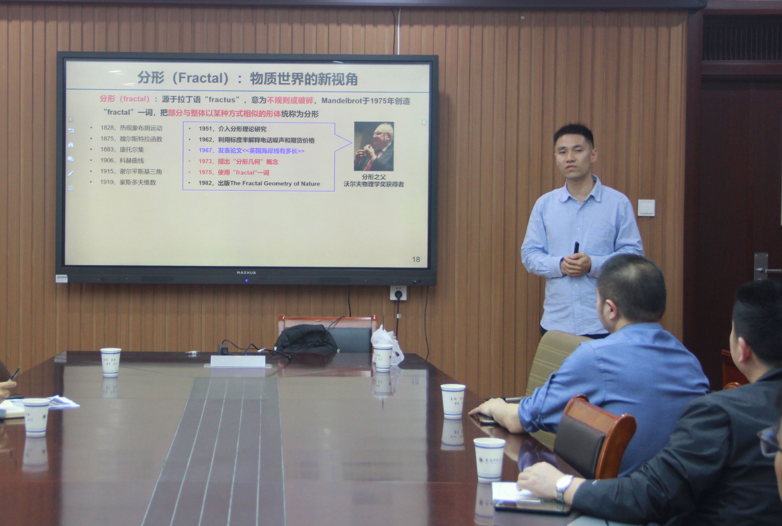 李连伟教授作了题为“支化高分子的分形之美”的学术报告。李教授首先介绍了什么是分形以及分形的发展简史和基本概念,随后李教授讲解了支化高分子是否具有统计分形特征,李教授接着阐述了支化高分子的分形结构与性质关系。最后,李连伟教授讲解了从简单到复杂、从线性到支化的分子结构演化进程是自然选择的必然结果,并详细阐明课题组所关注的核心科学问题:无规则支化高分子是否具有统计分形特征。会后,李连伟教授与参会师生展开了一系列学术讨论,并回答了与会师生提出的问题。