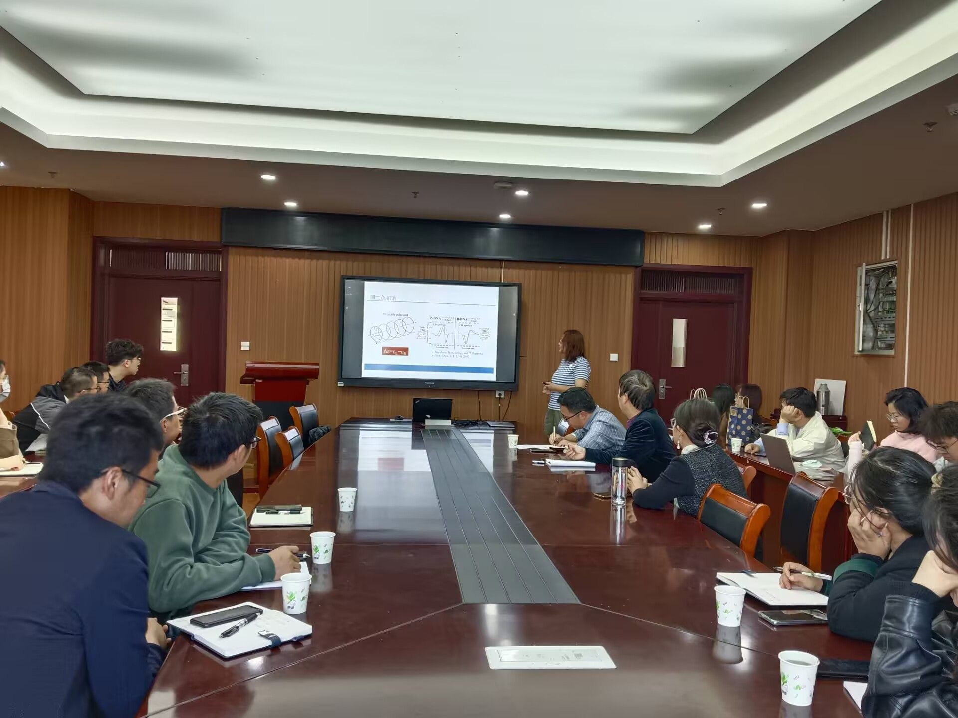 陈曦教授作了题为“纳米团簇的手性光学性质”的学术报告。陈教授从手性和圆二色相谱,手性纳米团簇及银纳米颗粒增强分子手性光学信号三个方面讲解了纳米团簇的手性光学性质。其中,关于手性纳米团簇部分,陈教授从DNA-Ag8团簇和圆二色相谱程序开发以及在配体保护贵金属团簇中的应用进行了讲解,阐述了DNA-Ag8团簇的晶体结构以及配体保护贵金属的8个方面,并举例讲解了多个关于银离子团簇的相关结构。会后,陈曦教授与与会师生展开了一系列学术讨论,并回答了与会师生提出的问题。