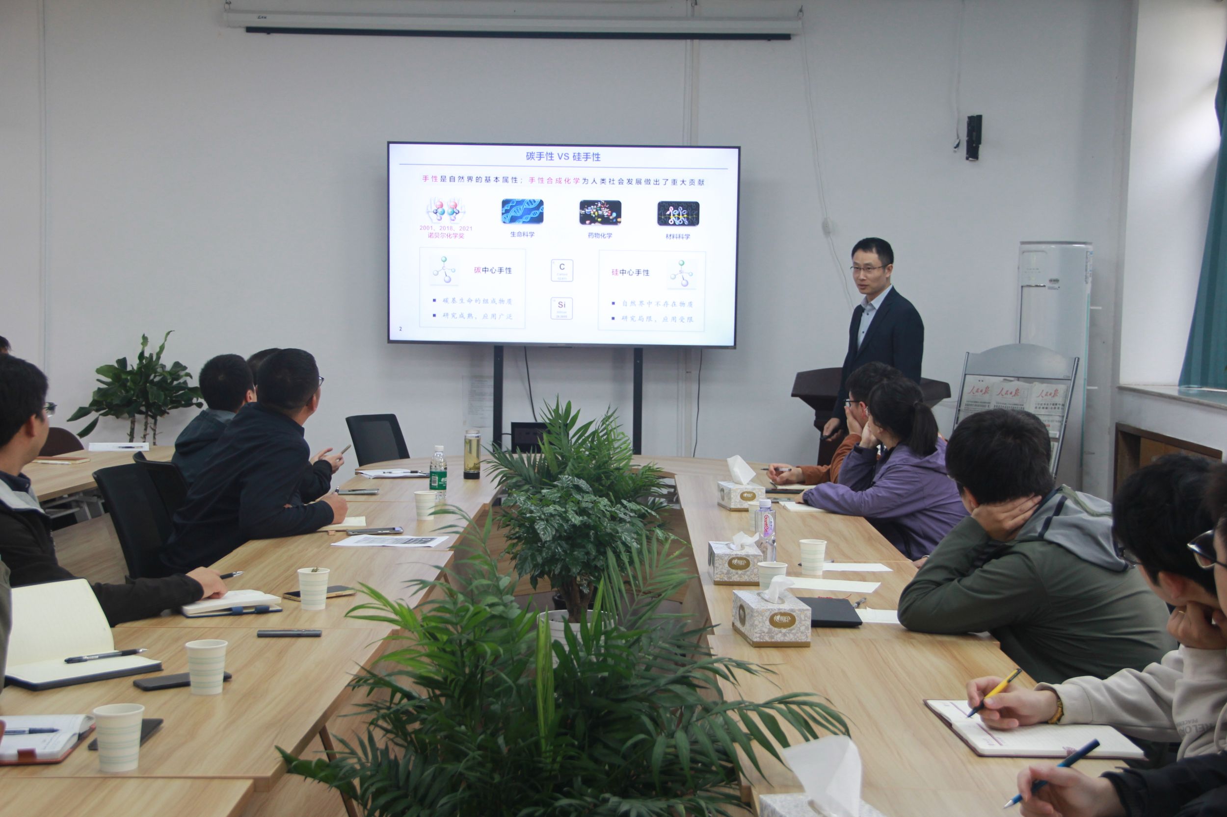 何川研究员作了题为“New Adventures in Silicon- and Boron-Stereogenic Chemistry”的学术报告。何川研究员首先从手性有机硅化学所遇到的问题如硅中心手性物种匮乏、高效合成方法局限等展开,接着展示了目前所围绕着手性有机硅化学系统的打造的一类具有标签特色的不对称脱氢偶联反应。何川研究员系统的阐述了硅基配体在碳氢硼化和碳氢硅基化起到的重要作用,随后由杂原子中心手性引发了对手性有机硼化学的思考以及进一步研究。最后何川研究员对手性有机硅/硼化学未来的发展应用进行了展望。会后,何研究员与与会师生就报告内容进行了讨论并回答了与会师生提出的问题。
