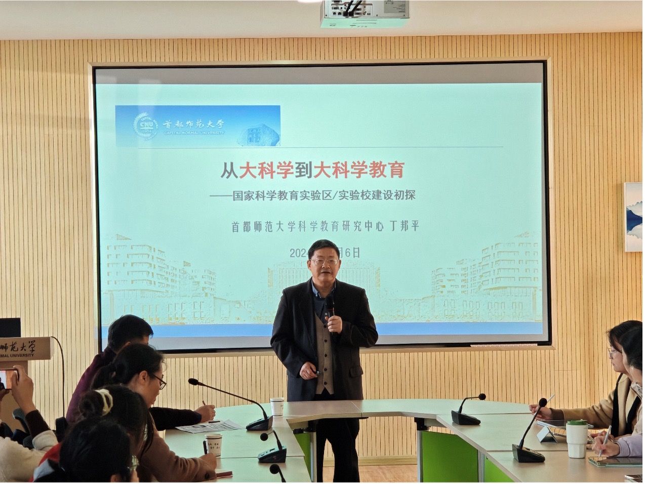 丁邦平老师以《从大科学到大科学教育》为主题开展报告,他首先介绍了大科学的研究背景,提出了“什么是科学”这一问题,通过分享他在新西兰访学期间当地小学生对这一问题的回答,深入探讨了科学精神和科学的价值等问题。然后从国家政策、理论探索和实践研究三个层面对大科学教育进行了介绍,指出大科学教育是新时代我国科学教育为适应大科学和大教育而提出的新型科学教育,它重构了科学教育体系,适应人才培养的需要,并在实践中取得了一定的进展。