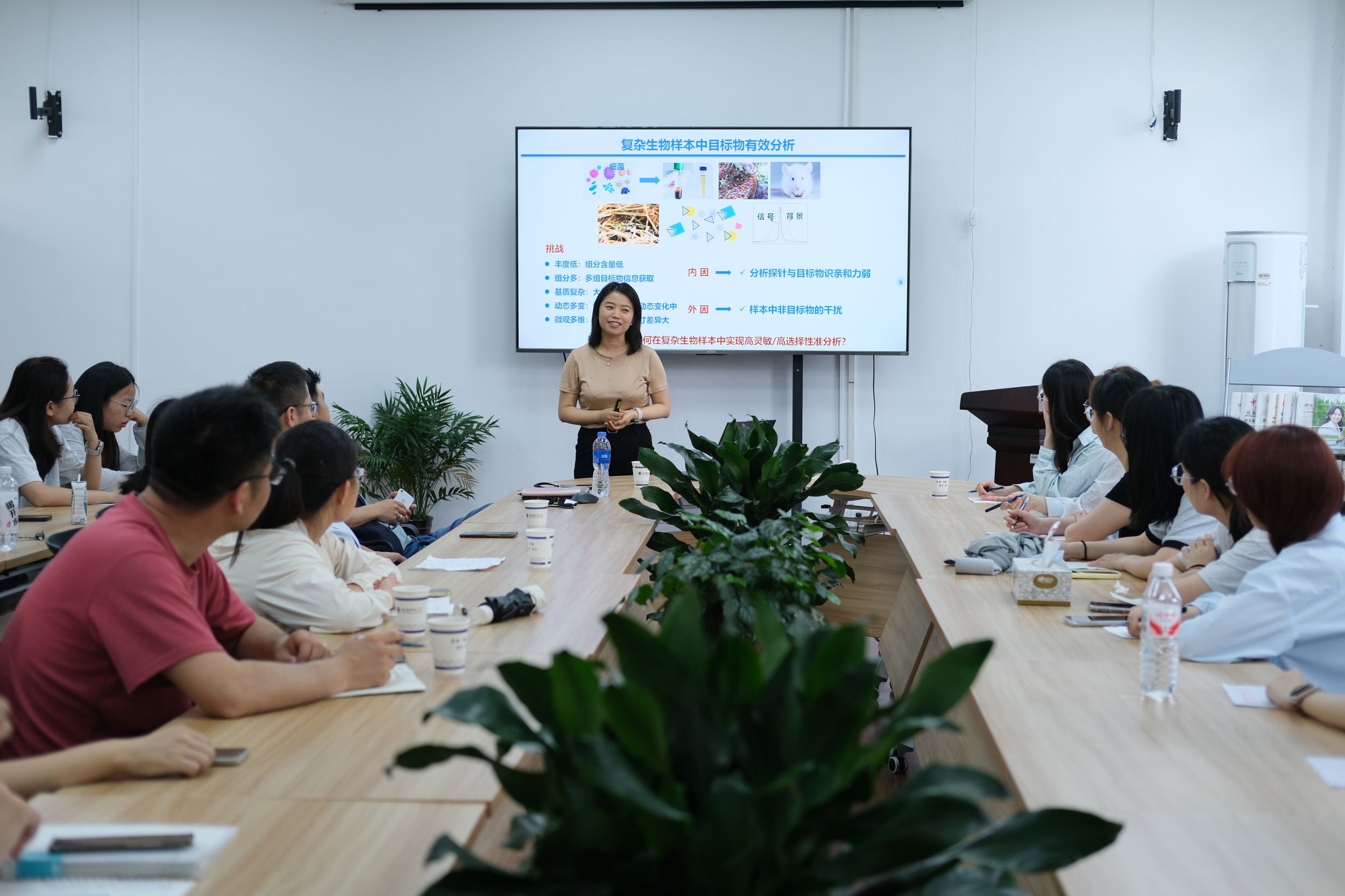 宋尔群教授作了题为“致病菌的光磁传感分析”的学术报告。宋教授首先系统阐述了在复杂生物样品中对目标物进行有效分析所面临的挑战及其成因,指出当前技术在选择性、灵敏度及成像精度方面的局限。随后,宋教授介绍了课题组在该领域所开展的一系列研究工作,围绕酶、ROS、酸性环境等微环境激活机制,构建了多种光/磁传感探针体系,包括:酶激活FRET荧光探针解组装、酶激活CBT-Cys点击AIE探针自组装、酶激活CBT-Cys点击荧光探针解组装活体胞内菌原位成像、微球核酸酶特异激活胞内细菌原位成像、ROS激活MRI ON实胃部幽门杆菌特异成像、酸激活MRI ON实现腹膜中致病菌成像等构建了系列基于微环境激活调谐的光/磁传感探针,实现了活细/活体中致病菌精准灵敏成像分析。在展望未来研究方向时,宋教授提出三点关键发展策略:开发更具特异性/多参数级联激活光磁传感探针以提高准确性;开发具有更高信噪比光磁传感探针以提高灵敏度;探究活体胞内菌精准分析方法及细菌与宿主细胞相互作用示踪方法。会后,宋尔群教授就报告内容与参会师生展开讨论,并回答了师生提出的问题。