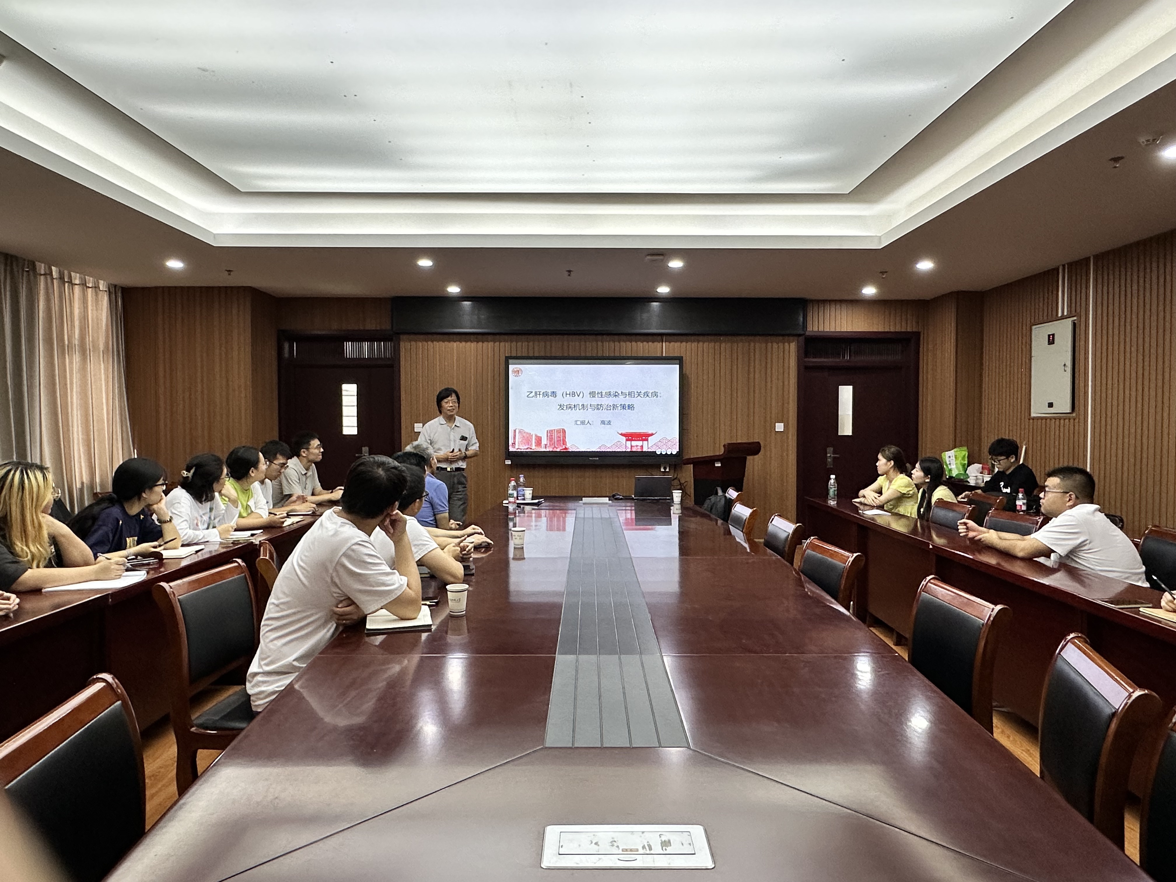 高波教授作了题为“乙肝病毒(HBV)慢性感染与相关疾病:发病机制与防治新策略”的学术报告。高波教授首先介绍了乙肝在我国的流行情况,并指出慢性HBV感染是导致肝纤维化、肝硬化及肝细胞癌的重要原因。在发病机制方面,高教授强调了病毒与宿主免疫反应之间的复杂关系,以及现有抗病毒药物在彻底清除病毒上的局限。随后高教授重点介绍了cccDNA在HBV生命周期中的关键作用。作为病毒特有的转录模板,cccDNA是乙肝持续感染的决定性因素,也是实现慢性乙肝治愈的最大障碍。结合团队的最新研究,高教授展示了IFI16与TRIM22在抗HBV活性中的作用,并提出激活STING通路能够有效抑制病毒复制、减轻肝损伤和肝纤维化。研究发现,轻度ER应激有助于细胞存活,而过度应激则可导致细胞死亡,病毒往往通过劫持这一机制促进复制。团队进一步揭示了ATF-6介导的ER应激在乙肝相关肝癌发生中的潜在作用,为未来治疗提供了新的靶点。会后,高教授与在场师生围绕乙肝防治策略、免疫调控机制及未来研究方向进行了深入交流。