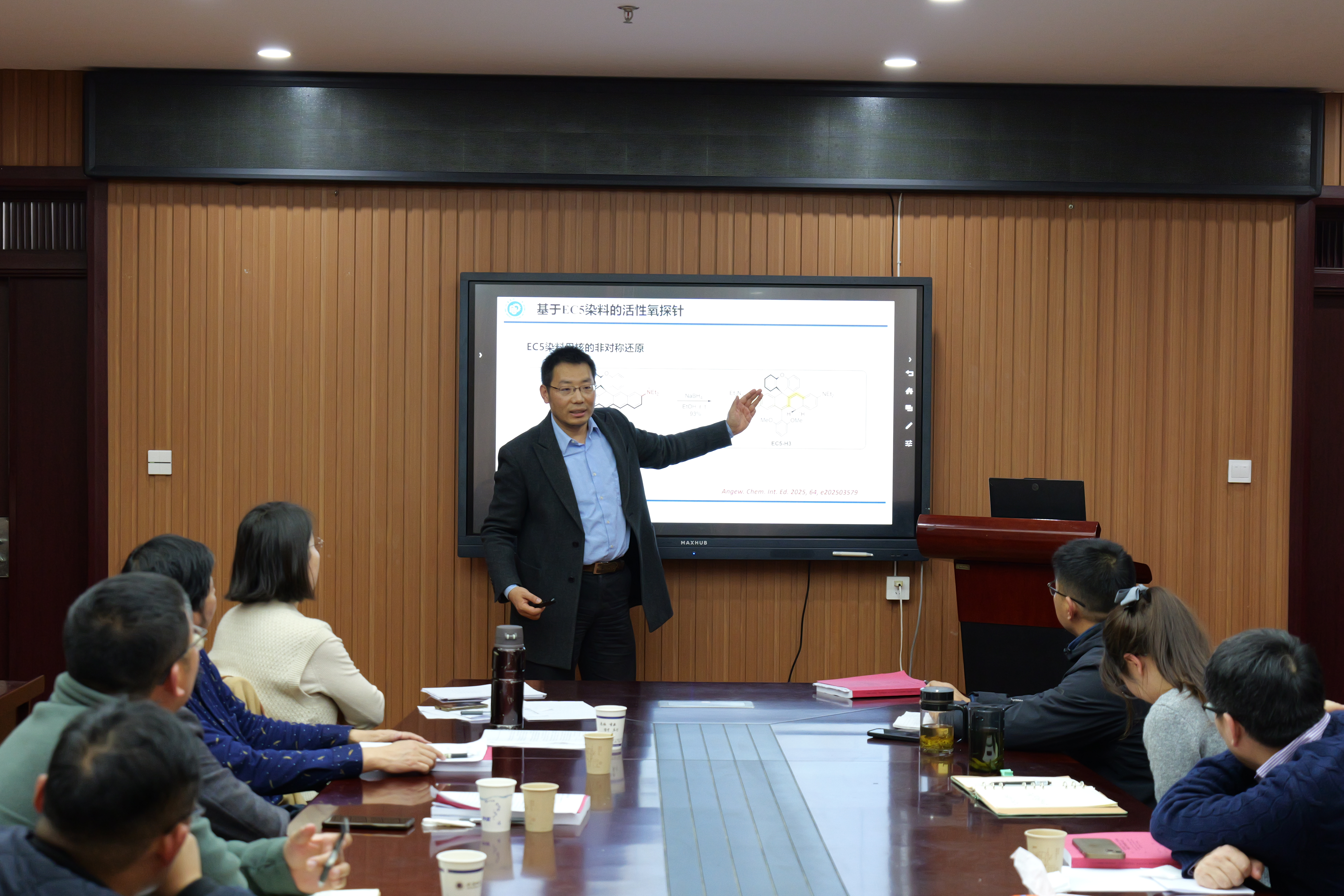 杨有军教授作了题为“红外咕吨染料分子工程”的学术报告。他首先简要介绍了有机染料在细胞染色、染色体发现、抗生素、光敏剂及DNA测序等领域的广泛应用,并指出近红外光吸收与发射的有机染料在生物医学领域具有重大需求,然而目前可用的近红外有机染料种类十分有限。同时,随着吸收与发射波长的红移,染料的HOMO-LUMO能级差降低,导致其易于发生氧化还原反应,存在本征不稳定性问题。此外,当前近红外染料以花菁类衍生物为主,其分子中含有多重双键结构,易受生物体系中亲核分子的加成作用影响,并且双键本身也容易发生光降解。针对这些挑战,杨有军教授课题组长期致力于开发在生物介质中具有高稳定性的近红外染料,成功设计并构建了一系列吸收与发射波长可达1300 nm的近红外EC染料。课题组创新性地提出立体架构染料策略,通过引入立体位阻基团,有效屏蔽亲核试剂进攻,从而显著提升了染料的化学稳定性。进一步地,他们利用硅桥连基团对EC5染料进行结构改造,研发出ESi5染料,使其性能得到进一步提升。相较于传统的花菁类染料(如Cy系染料及吲哚菁绿),杨老师所发展的EC系列近红外荧光染料在多个关键指标上展现出了显著的优势:其谱峰窄、荧光强度高,有助于实现更清晰的荧光标记与成像效果;同时具备优异的光稳定性,在相同光照条件下的光漂白比例仅为吲哚菁绿的1/10至1/1000。此外,该系列染料还展现出良好的生物相容性,能够抗光漂白、抗氧化并抵抗生物硫醇的加成作用,适用于细胞与生物组织的染色。杨老师进一步展示,这类染料不仅在小动物活体荧光显微成像中表现突出,还兼具光热、光声和光动力等多重功能。它们不仅能够满足生物医学领域在红外成像与光热消融等方面的迫切需求,更凭借其独特性能,为细胞及活体荧光成像提供了有力的技术支撑。最后,杨教授介绍了课题组近期通过在外围引入烷基取代基以显著增强染料摩尔消光系数的研究进展,并提出了“量子限域超吸收染料”这一新颖设计理念。报告结束后,杨有军教授与在场师生展开了深入的学术讨论,并对与会者提出的问题进行了详细解答。