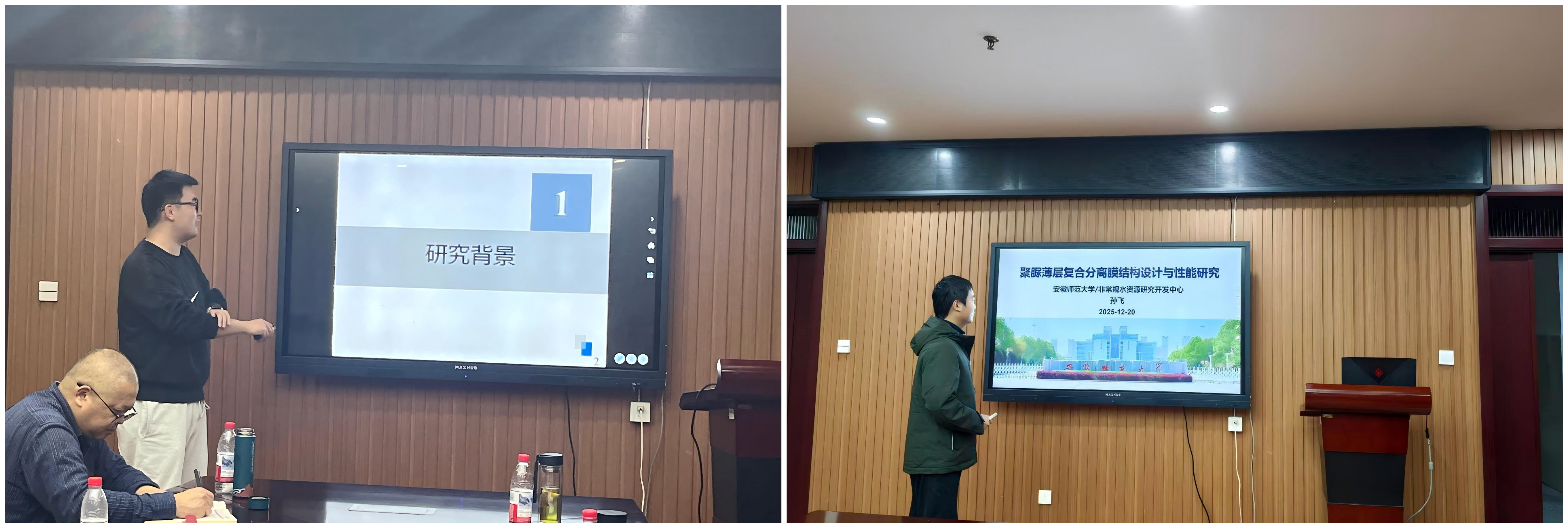 随后,中心青年骨干姚宇洋博士、孙飞博士汇报了“表面改性抗污型离子交换膜”和“聚脲薄层复合分离膜”的工作进展,现场师生与报告嘉宾就膜污染控制、规模化制造等热点问题展开热烈讨论,气氛活跃,互动频频。