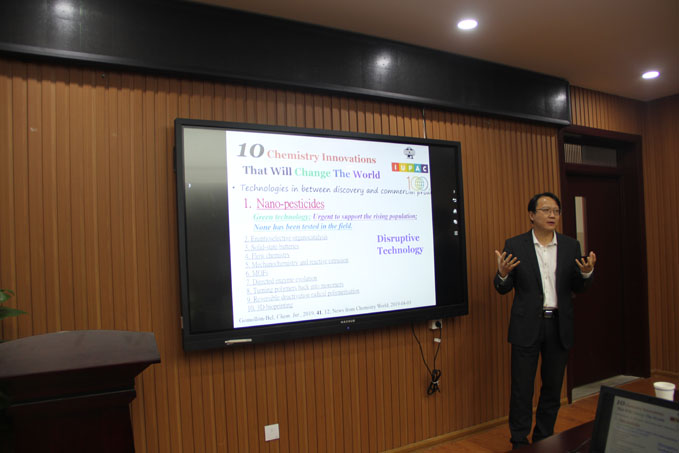 Healthcare”的学术报告。余教授以化学创新概念“Nano-pesticides”开启讲学,然后围绕“功能材料的设计制备”和“功能材料的应用研究”两个方面进行详细讲述。在功能材料的设计制备部分,余教授主要分享了如何探索新方法和制备新材料,比如来自于大自然的灵感,面对生态系统和健康面临的重大挑战,设计粗糙形态物质增强表面粘合力;举例说明一种双粘性冲头二氧化硅纳米农药的设计以及进行耐雨性测试和光稳定性测试。在功能材料的应用研究部分,主要介绍绿色杀虫剂、绿色饲料、药物输送、免疫佐剂、生物检测技术以及简单介绍水处理和能源材料。如安全的功能性纳米颗粒二氧化硅、一种防治家禽球虫病的绿色纳米技术、氧化铁纳米颗粒的生物应用、IONP在肿瘤免疫治疗中的应用、巨噬细胞信号通路研究、预防性黑色素瘤模型的体内研究等。最后余教授以对自己科研方向的小结结束报告。会后余教授与与会师生进行了交流互动,与会师生获益匪浅,掌声不息。