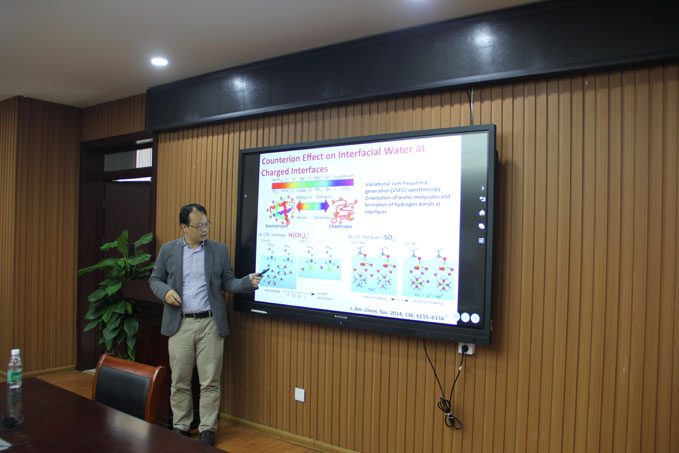 Electrolyte Materials for Biomedical Applications”的学术报告。黄博士首先介绍了材料中离子的行为跟细胞蛋白质作用的机理,蛋白质的行为受制于不同的离子。随后介绍了蛋白质本身带电荷与溶液中离子相互作用,离子与离子之间的相互作用会破坏水层结构。最后介绍了离子交换、离子特性提供的生物运用,利用离子交换的非特异性制造亲水材料,维持表面电中性,从而制造抗非特异性吸附材料。报告会内容丰富精彩,黄博士还在会后与与会师生们进行了热烈讨论,师生们觉得受益匪浅。