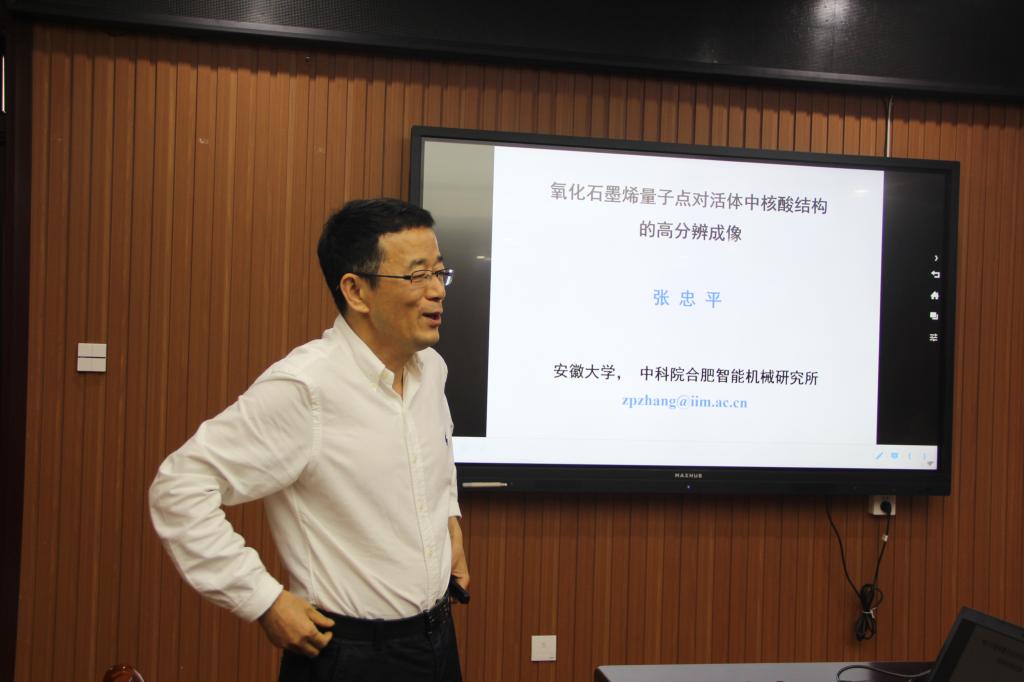 张忠平教授作了题为“氧化石墨烯量子点对活体中核酸结构的高分辨成像”的学术报告。张教授结合自身课题组的工作,讲述了在一流期刊发表论文的几个要素,强调了原创性更加提醒了应在工作中重视对反常现象的重视,扩展对其工作的见解。接着介绍了他们课题组近期来的一些工作。首先介绍了电荷修饰的氧化石墨烯纳米点的合成。随后介绍了纳米点与双链DNA和RNA的相互作用。最后提出问题假设,并就假设进行探索验证,从而有了非常意外的发现。最后,张教授通过自身的科学研究,告诫同学科研工作就是在不断地探索、试错、总结中产生的。会后,张教授与与会师生进行进一步的的交流。