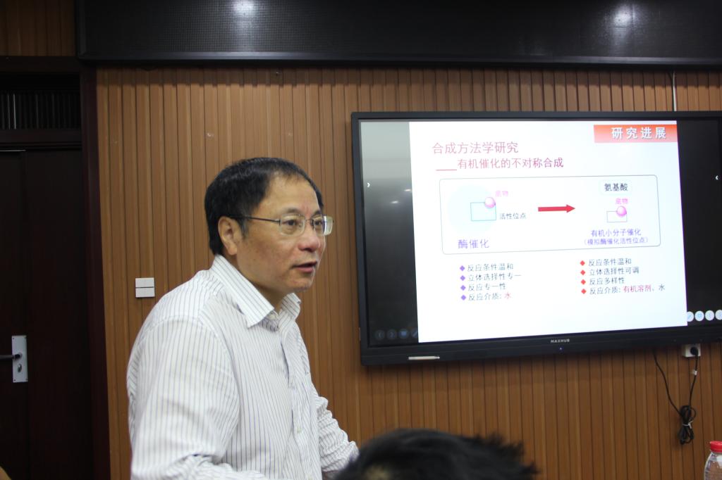 赵刚研究员作了题为“氨基酸衍生的手性离子对催化不对称反应”的学术报告。赵刚研究员从酶最基本的结构单元氨基酸展开讲解,经过简单化学转化发展出具有酶催化剂的优点的结构多样的有机小分子催化剂,从而实现“源于自然,优于自然”的人工酶催化剂的目标。在此研究思路基础上,基于廉价、易得的天然手性源(如氨基酸、生物碱),设计、合成了一系列新型手性伯胺-仲胺、伯胺-叔胺、伯胺-膦、叔胺-硫脲、含氢键相转移催化剂等有机小分子催化剂。它们能够高效、高对映选择性催化碳-碳键、碳-氧键以及碳-氟键形成等反应,催化多组分串联反应一步形成多个手性中心并且反应具有较广的底物普适性,取得优异的产率、对映选择性,该类反应具有低催化当量以及反应时间短的特点。初步揭示的反应机理,可以观察到手性非线性效应在同一反应中随底物不同而变化。双试剂手性离子对的催化策略和概念拓展了手性膦催化反应的范围,可能带来新的反应与应用。最后,与会师生就报告内容展开了热烈讨论。
