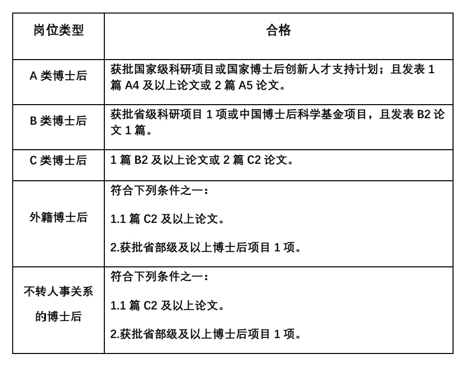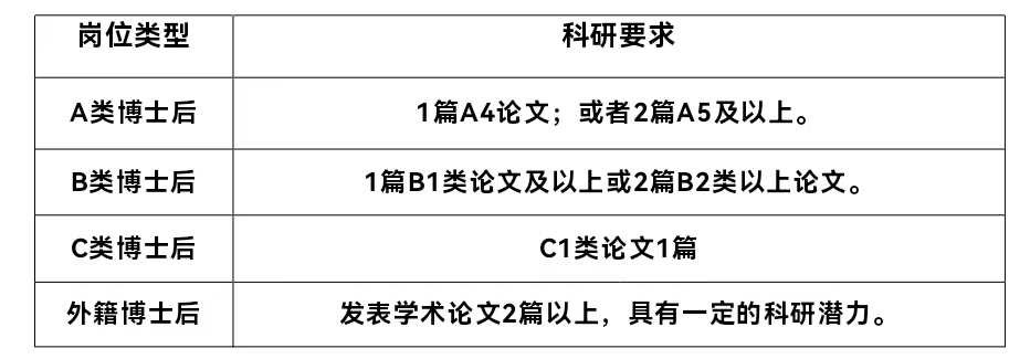 5.具有较强的科研能力和创新能力,具备较强的学术发展潜力。申请不同岗位类型博士后的科研条件参见下表: