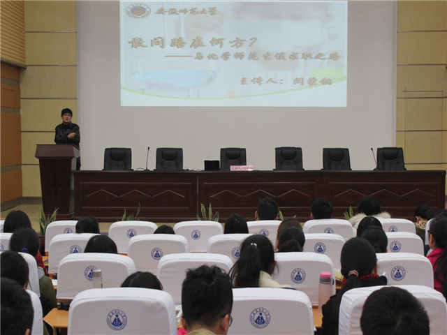 全体师范生做了题为“敢问路在何方?——与化学师范生谈求职之路”的专题讲座。化学系主任阚显文老师、副主任孙影老师,化教论专业阙荣辉老师,学院全体辅导员老师及各年级师范生三百余人现场聆听了讲座,讲座由院党委副书记余妍霞主持。