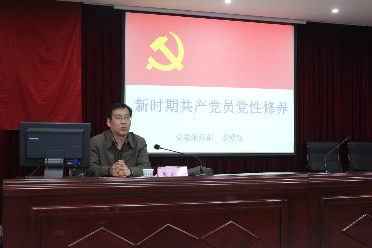 季爱新老师通过理论与实践的结合,广度与深度的结合分别从“什么是党性修养”、“为什么要加强党性修养”和“如何加强党性修养”三个方面对新时期共产党员党性修养进行了生动的讲述。季爱新以清晰明了的逻辑思维层层递进、引经据典,结合《论语》、《论共产党员的修养》等著作,将优秀传统文化与共产党人的党性修养相结合,鞭辟入里的阐明党性修养的涵义;他深入浅出,从闯王李自成讲到天安门事变,从周恩来总理传奇人生讲到国共差距,引人入胜的讲解党性修养的必要性;他诙谐风趣,结合自身的成长实践为学员们指出提高党性修养的途径。他指出,加强党员队伍建设的同时,在某种程度上,党员的党性可以理解为党员的学习性。同时,他还强调,党员就是要在平时能看得出来,需要的时候能做得出来,关键的时候能站得出来。作为一个党员,要经常的自我反省,克服贪图安乐,防止腐化堕落,把反面的典型作为自己的警示。每一位党员都是一面旗帜,只有把自己做好,坚持自我约束,才能做一名合格的党员。
