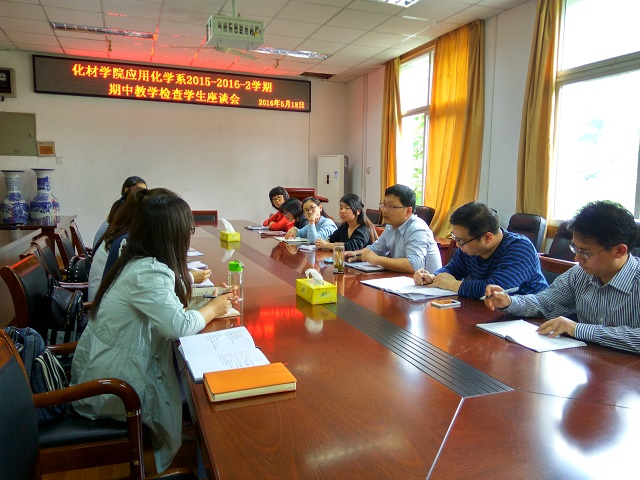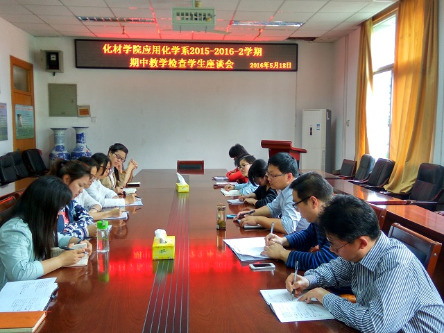 应用化学系2015-2016学年第二学期期中教学检查学生座谈会。此次会议旨在聆听学生学习中遇到的难题及教师教学中存在的问题,张小俊副院长、学院教学秘书、应用化学系正副主任,应用化学系辅导员及各年级学生代表共20余人参加了座谈会。