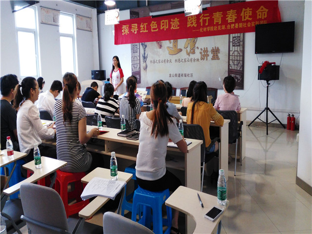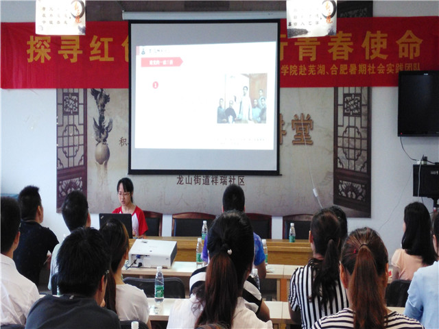 赭山校区食堂门口集合,收拾心情、整装待发,并于8点到达目的地龙山街道祥瑞社区居委会会议室。宣讲在9点正式开始,与会成员有社区书记、副书记,社区中共党员、预备党员和实践团队各成员。会场气氛颇好,大家热情洋溢。