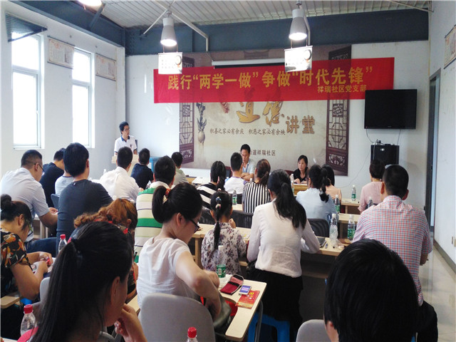 团队活动结束后,社区书记、副书记主持召开了祥瑞党支部优秀党员表彰大会和践行“两学一做”,争做“时代先锋”的学习讲座,团队成员仔细聆听,认真学习。