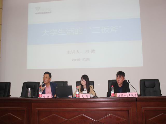 第十届安徽省“十佳大学生”提名奖、第八届感动师大“十佳大学生”光荣称号、安徽省 “感动江淮”志愿服务优秀个人、安徽好人刘傲以大学生活的“三板斧”为主题,分“找到适合自己的平台”、“坚持自己的梦想”、“保持你的创造力”三个模块,向新生们讲述了自己的大学历程和创业故事,他建议同学们首先寻找一个适合自己的发展平台,用“踏实、责任心、坚守”三个法宝武装自己,坚持自己的梦想并去努力实现,时刻保持自己的创造力,走好大学之路,并选择性地走好创业之路。