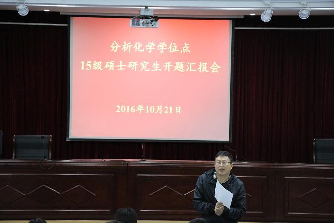 开题报告是研究生培养过程中重要的一个环节,是对研究生工作的一个阶段性考核,是保证研究生培养质量的一个重要举措。10月21日上午十点,分析化学学位点在图书馆报告厅隆重举行了2015级硕士研究生开题汇报会。学位点导师和全体硕士研究生一起参加了本次会议。会议分为上午和下午两个阶段进行,分别由张玉忠教授和夏云生教授主持,2014级和2016级硕士研究生全程进行了观摩。
